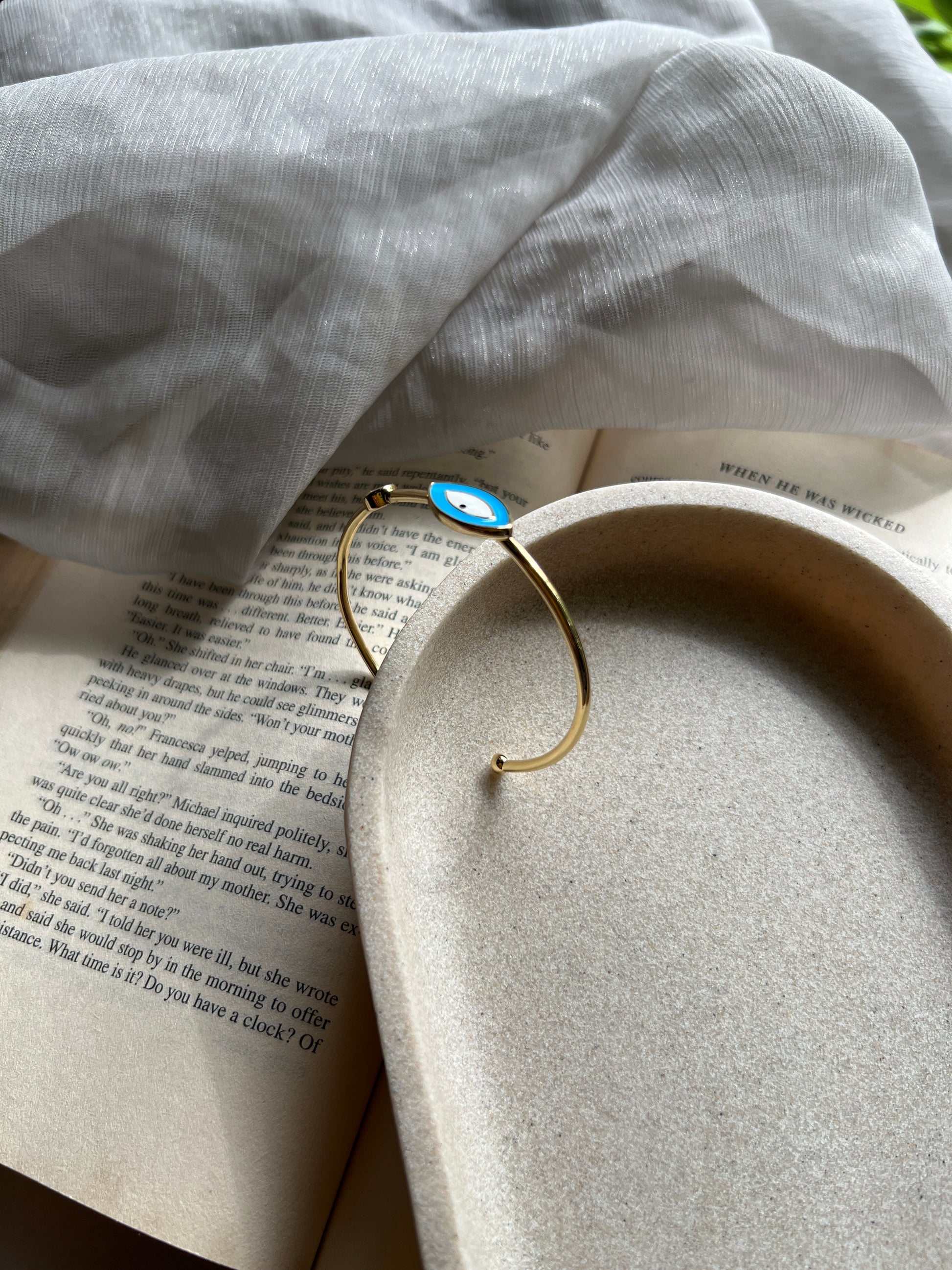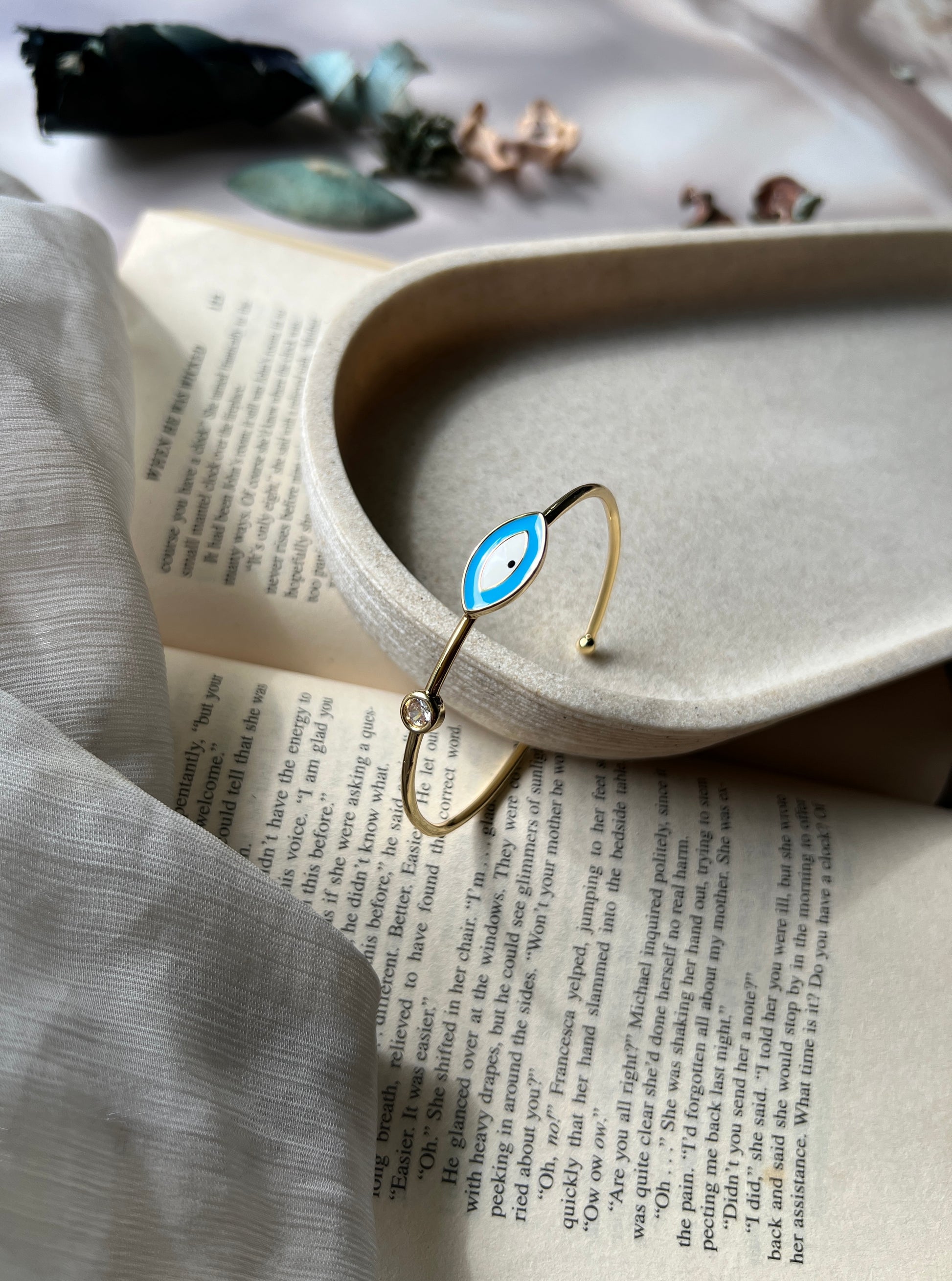 A contemporary cuff bangle designed with vibrant evil eye accents that catch the eye instantly. Plated in premium gold, this modern and stylish piece brings together tradition and trend, symbolizing protection while adding a pop of color to your look. Its sleek design makes it a versatile accessory, perfect for elevating both everyday wear and special occasions.