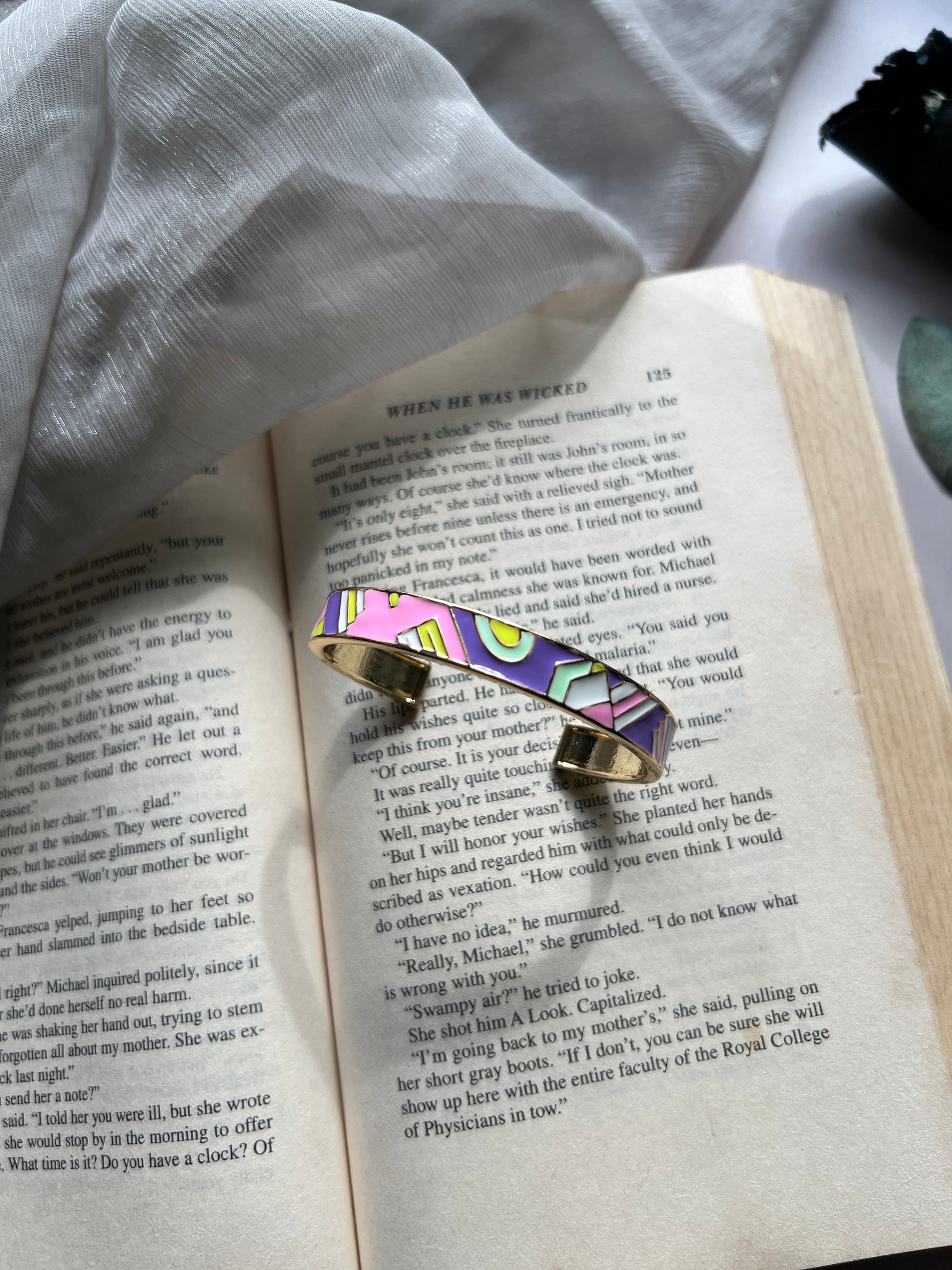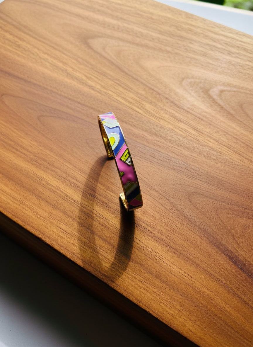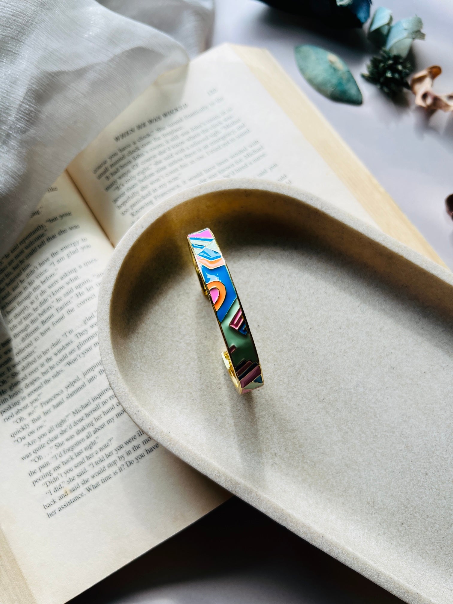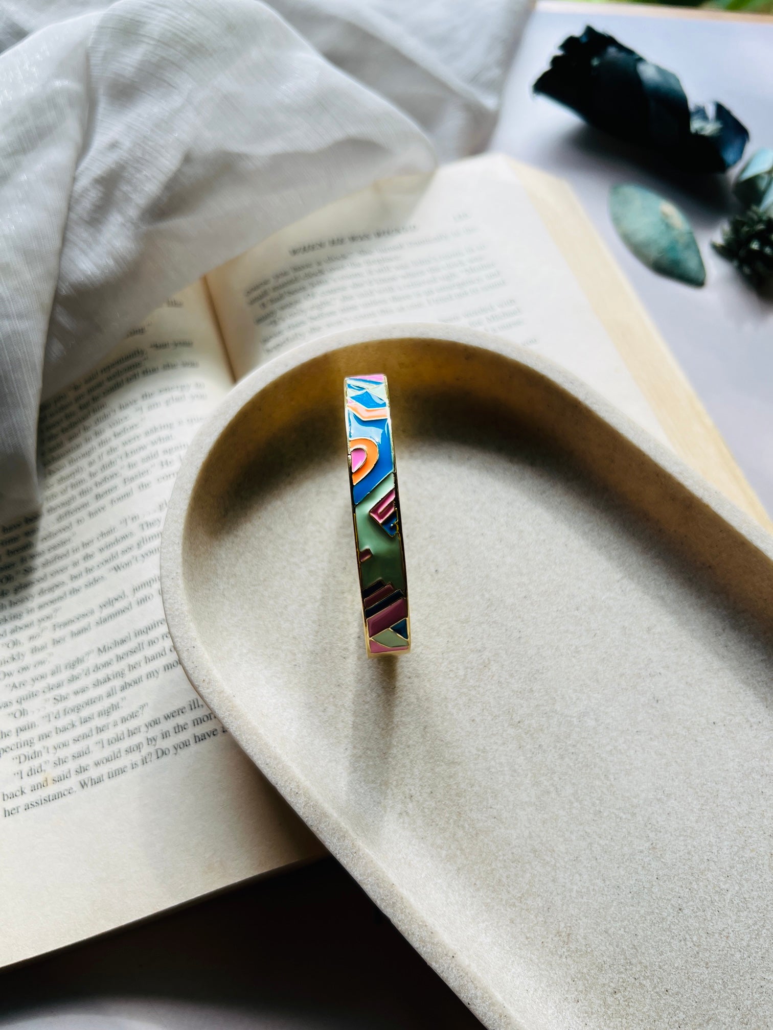 The Aurora Cuff Bangle is a vibrant celebration of color and style. Designed in a sleek cuff style, this contemporary piece features a striking burst of colorful patterns that make it truly stand out. Its modern yet elegant design adds a playful charm, making it the perfect accessory to brighten up any outfit. A bold yet graceful bangle for those who love to express their individuality with style.