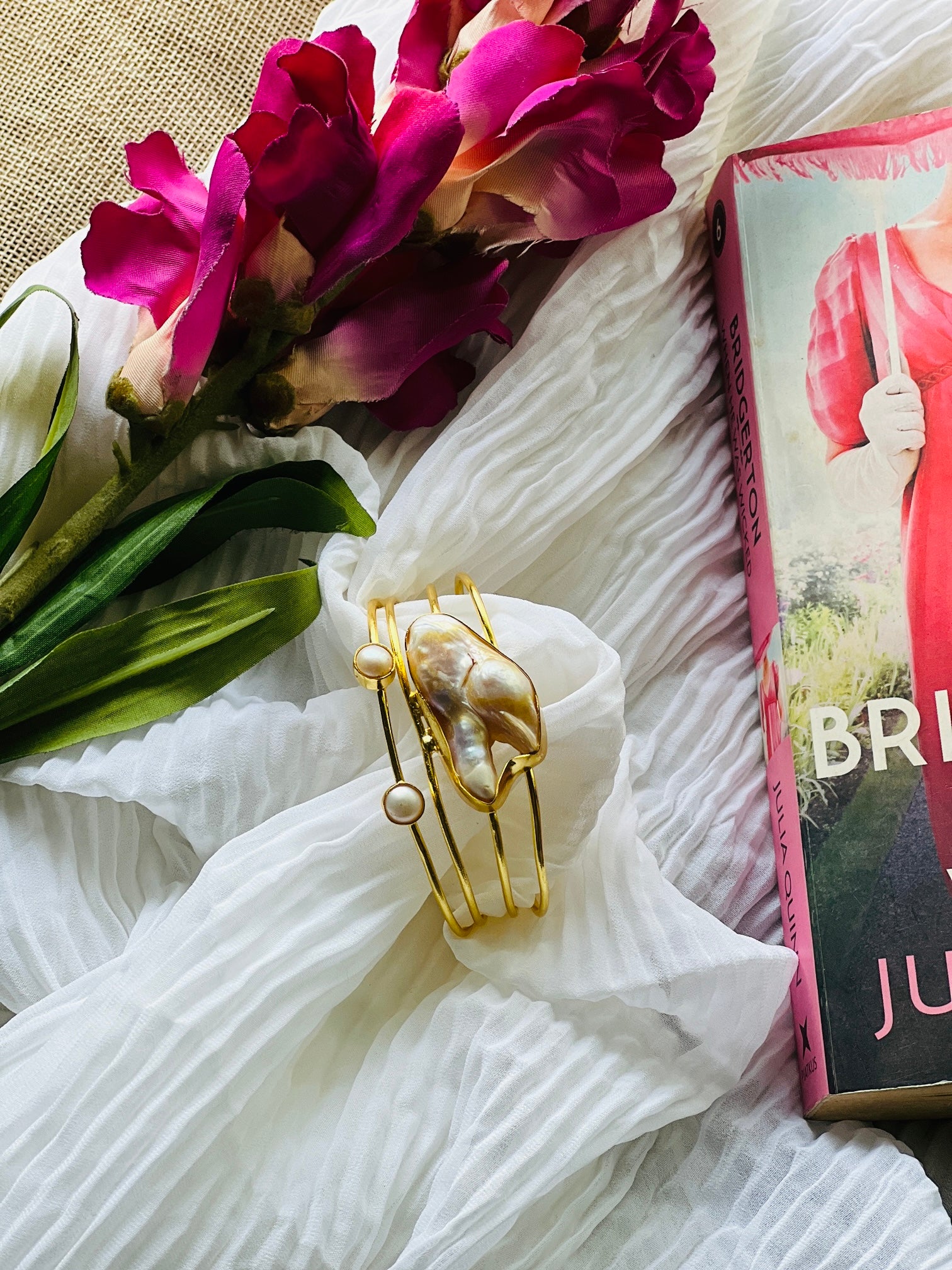Elevate your style with the Baroque Majesty Pearl Bangle, a bold statement piece featuring a stunning combination of luminous Baroque stones and classic pearls. Designed with three elegant layers, this gold-plated bangle is adjustable to ensure a perfect fit. Its timeless charm and luxurious appeal make it an exquisite addition to any jewelry collection, effortlessly complementing both traditional and contemporary looks.