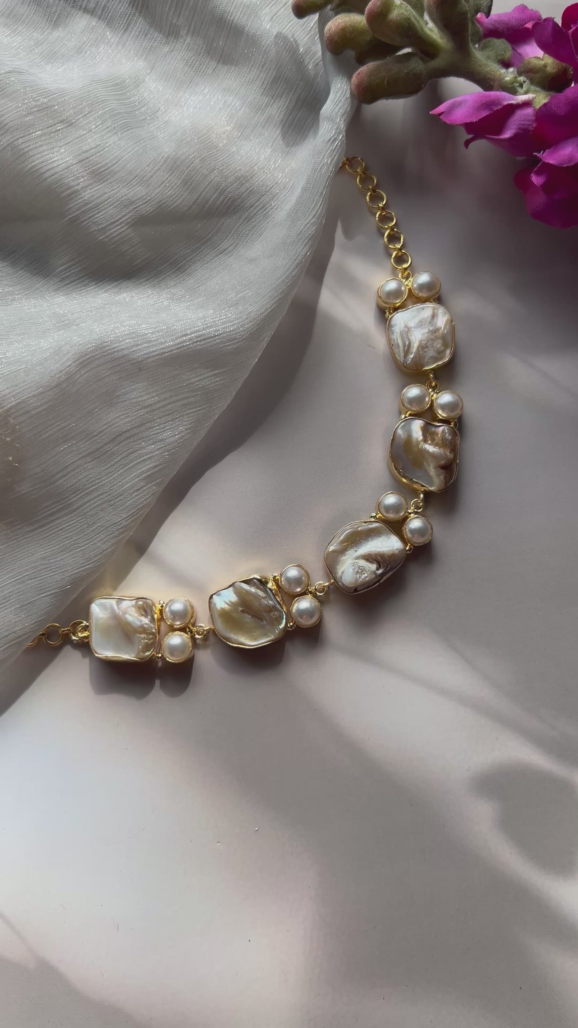 Experience opulence redefined with this Baroque Pearl and Stone Necklace, a masterpiece of timeless design and regal charm. The unique, irregularly shaped baroque pearls radiate natural beauty, while the intricately arranged stones add a touch of grandeur with their sparkling allure. Perfectly crafted to exude a royal look, this necklace is an ideal choice for special occasions or to elevate your everyday elegance. Wear it as a statement piece and embrace the sophistication and grace of true luxury.