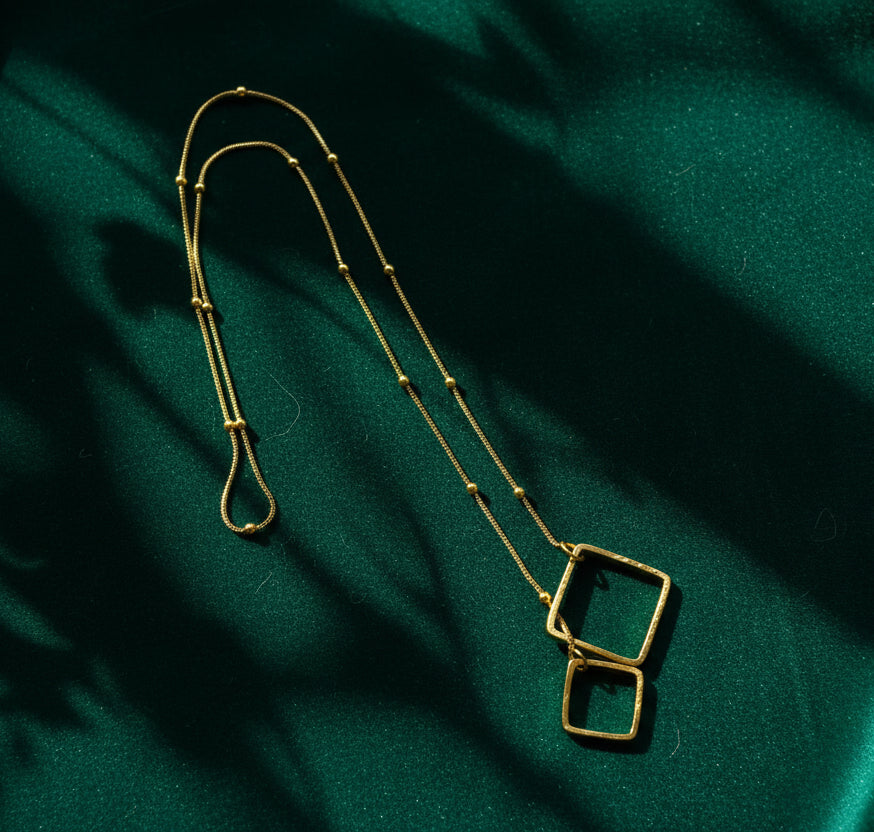 A refined gold-plated contemporary necklace featuring a long, elegant silhouette and an adjustable pendant for effortless styling. Designed to flow beautifully with modern outfits, this statement piece balances minimalism with sophistication—perfect for elevating everyday wear or adding a chic finish to special looks.
