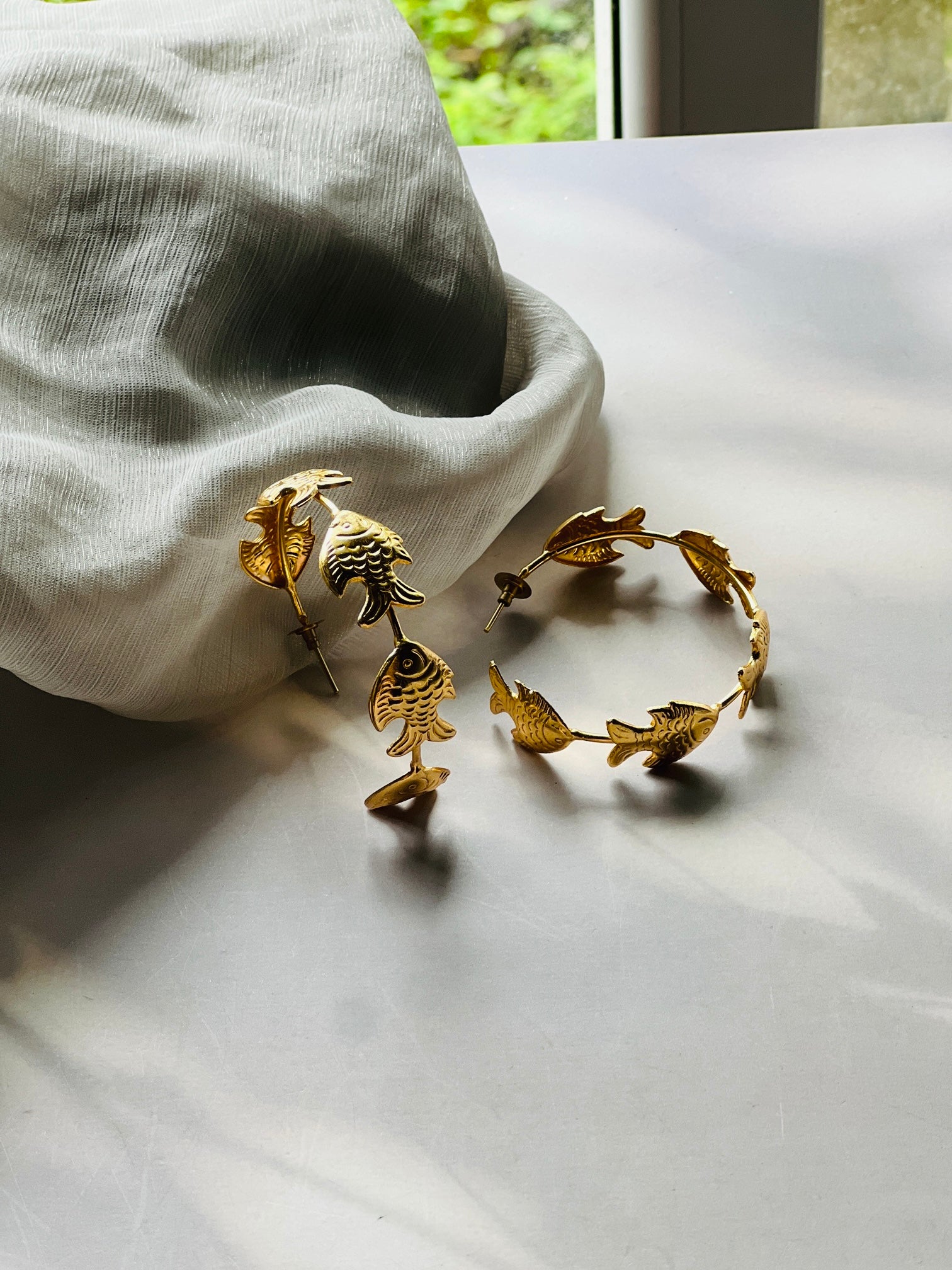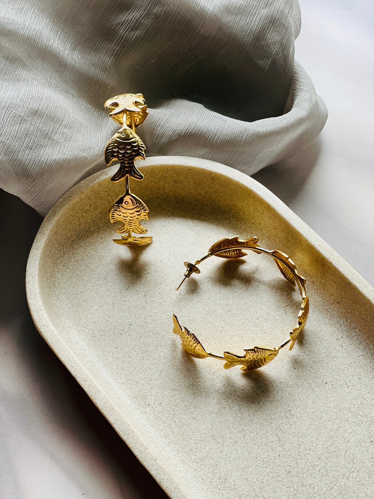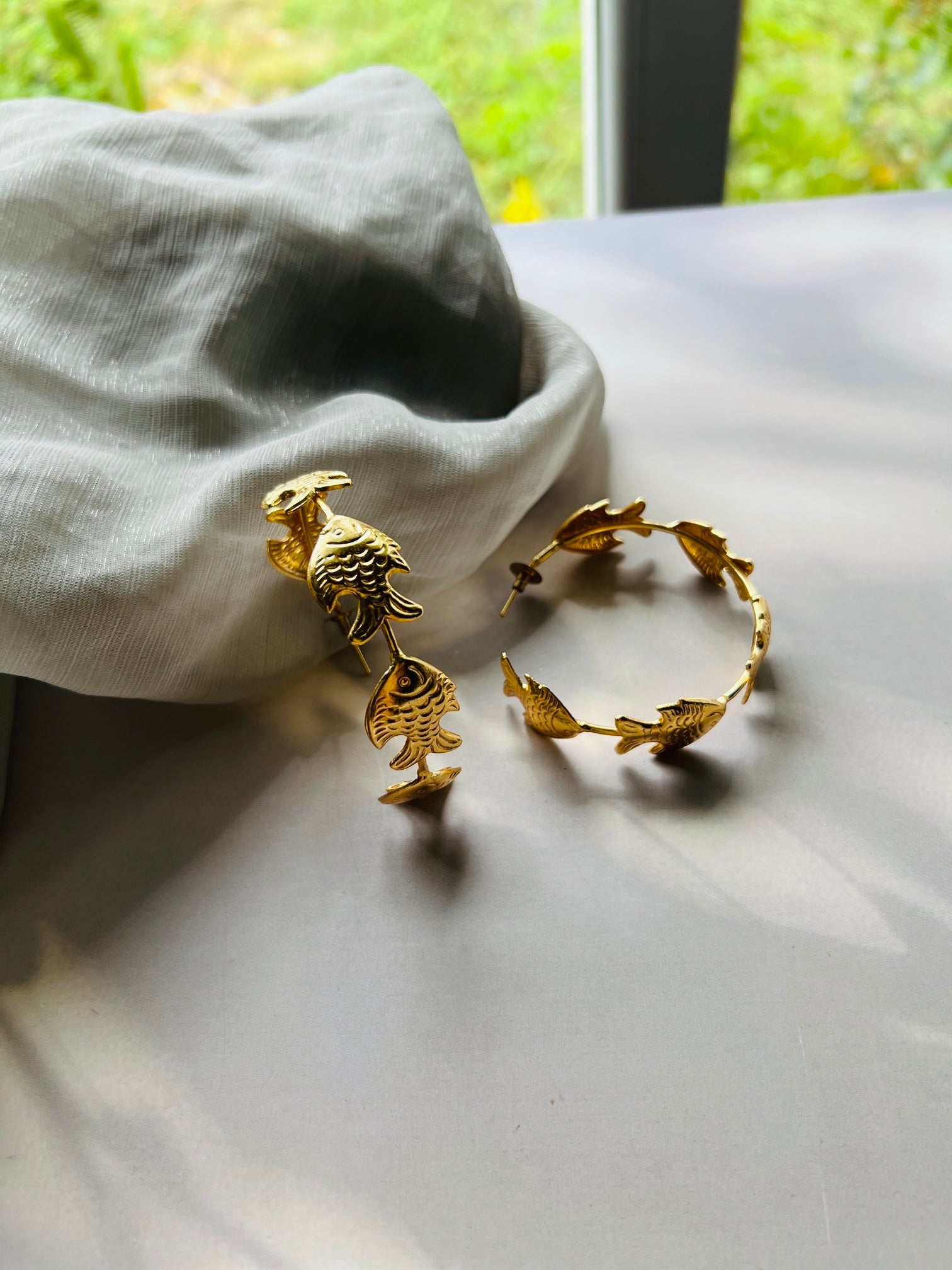 A graceful pair of Bali-style round hoop earrings featuring an intricate fish-pattern design. Handcrafted with fine detailing and finished in radiant gold plating, these medium-sized hoops strike the perfect balance between elegance and style. Lightweight yet eye-catching, they are a versatile accessory that adds a touch of artistry and charm to any look.
