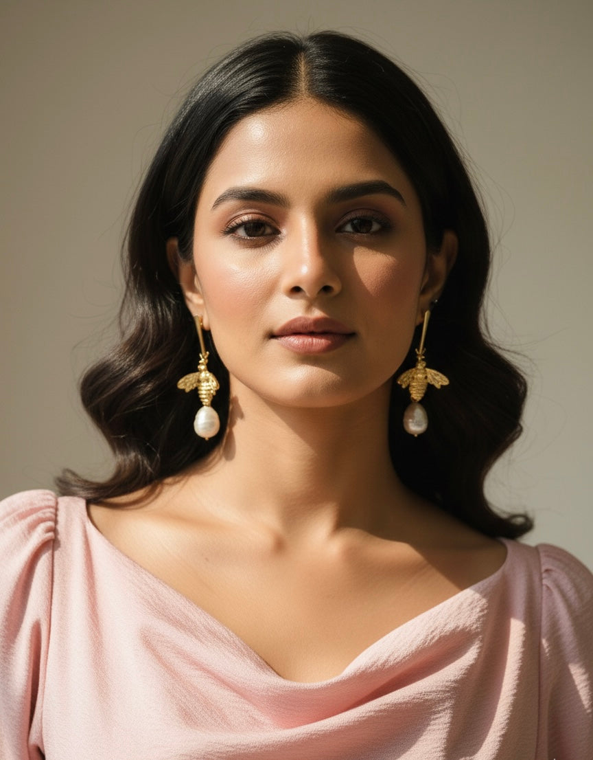 Delicately crafted with a refined bee motif, these earrings capture the quiet beauty of nature in a graceful, contemporary form. Finished in an antique gold tone, the detailed bee sits effortlessly above a soft ivory pearl drop, creating a gentle movement with every turn. Elegant yet distinctive, this piece is perfect for adding a subtle statement to both everyday ensembles and occasion wear.