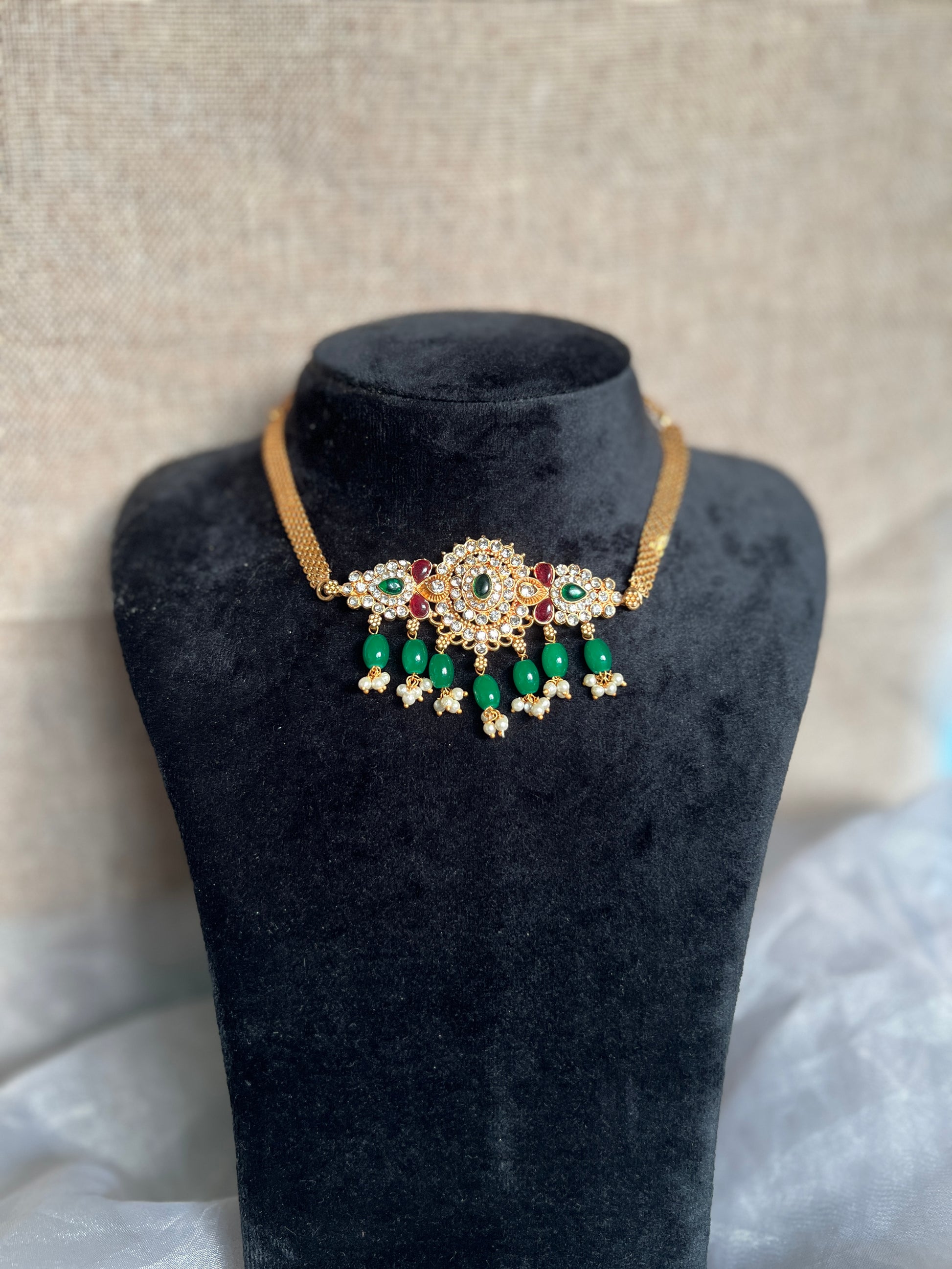 Indulge in the timeless elegance of this antique golden pearl choker. The rich golden hues of the choker perfectly complement the lustrous pearls, creating a sophisticated and classic design. The antique finish adds a vintage charm, making this piece ideal for traditional occasions or special celebrations. With its refined aesthetic, this choker is the perfect accessory to elevate any outfit, exuding grace and luxury with every wear.