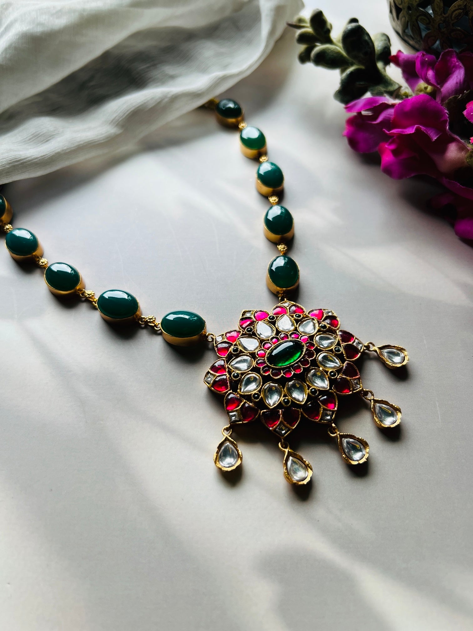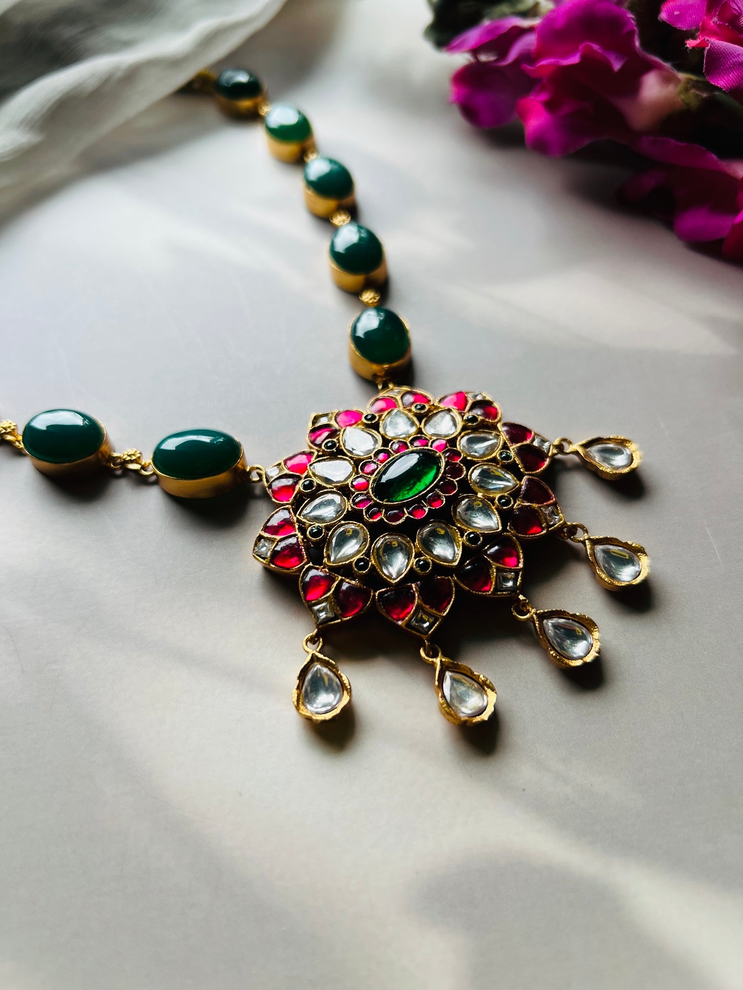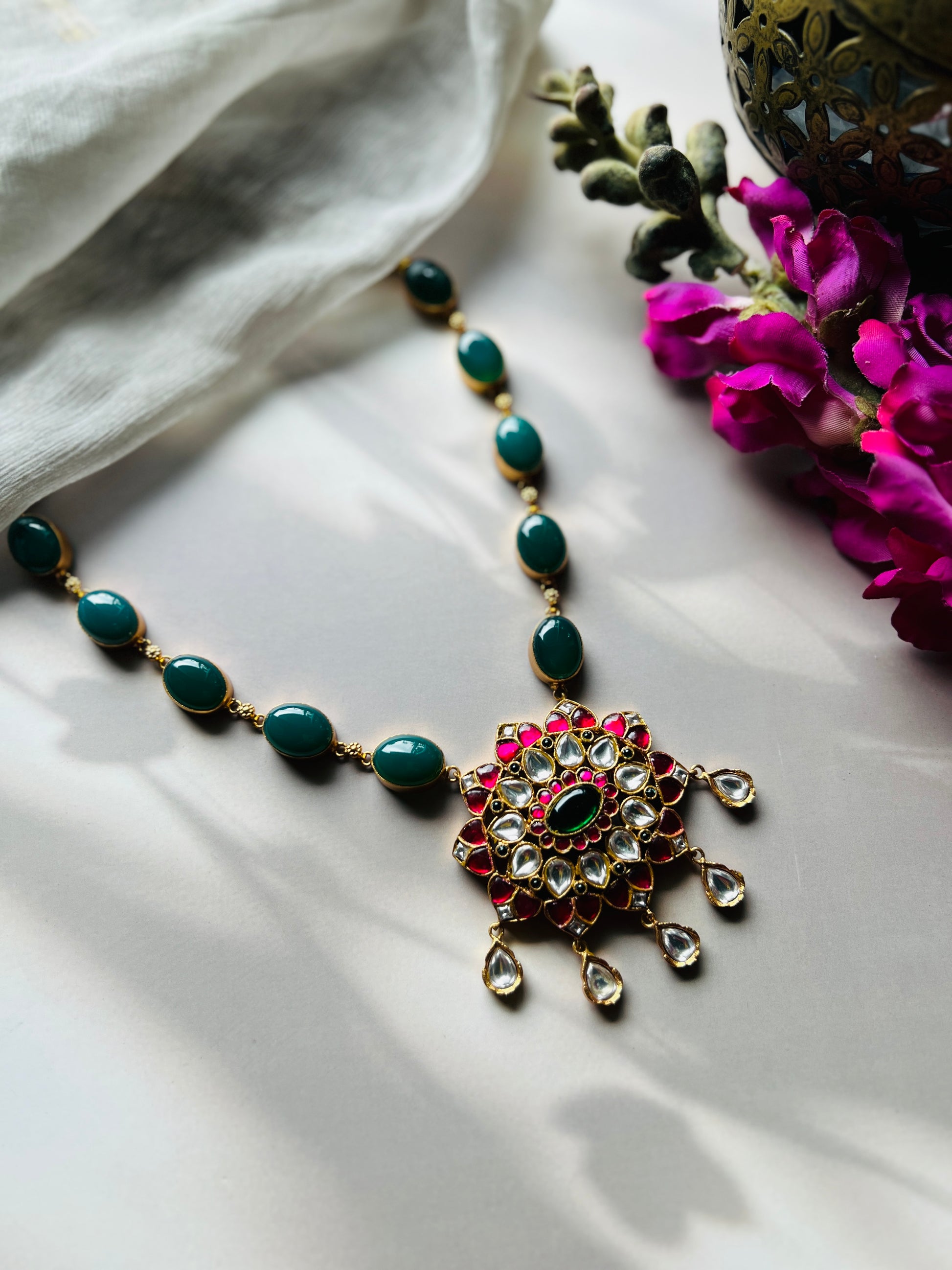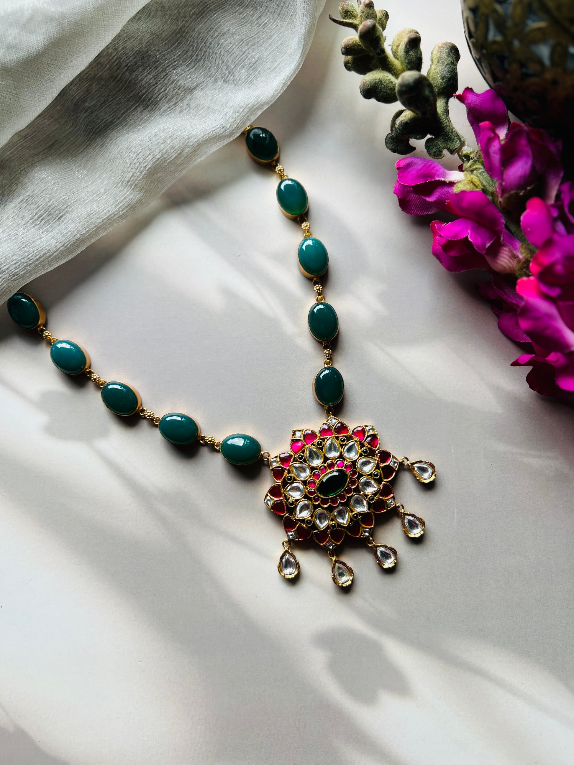 Grace meets grandeur in Lotus Radiance — a stunning short neckpiece adorned with a delicately crafted lotus-themed pendant. Handset in premium semi-precious natural stones, it radiates charm and serenity in every detail. A perfect blend of tradition and contemporary elegance, this piece is designed to captivate attention and elevate your look with effortless grace.