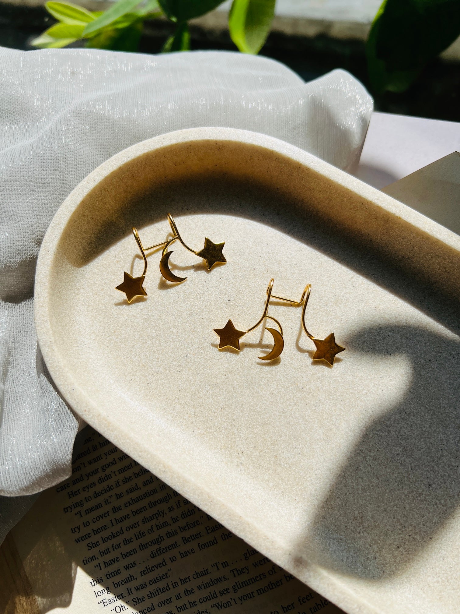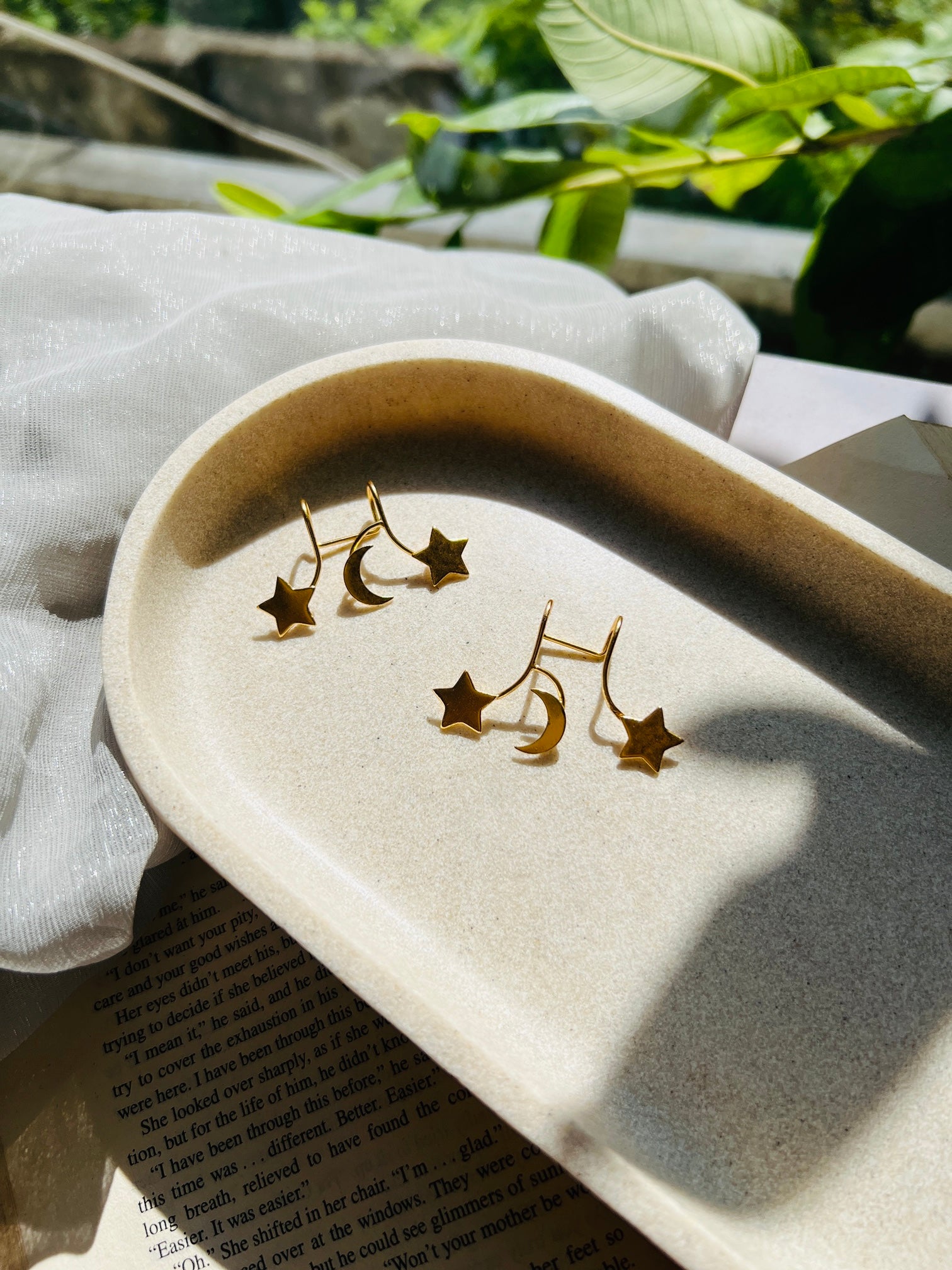 A captivating gold-plated pressing-style ear cuff designed with delicate stars and moons. Contemporary and versatile, this celestial-inspired piece can be styled at any part of the ear, adding a dreamy, stylish charm to your look. Perfect for those who love unique, modern jewelry with a touch of cosmic elegance.