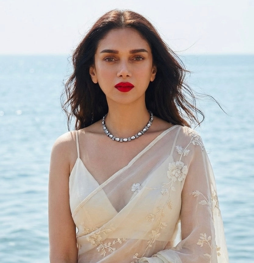 A charming choker set in a black silverish finish that blends subtle shine with modern elegance. Designed with delicate detailing and paired with matching earrings, this set adds a soft sparkle without being overpowering.