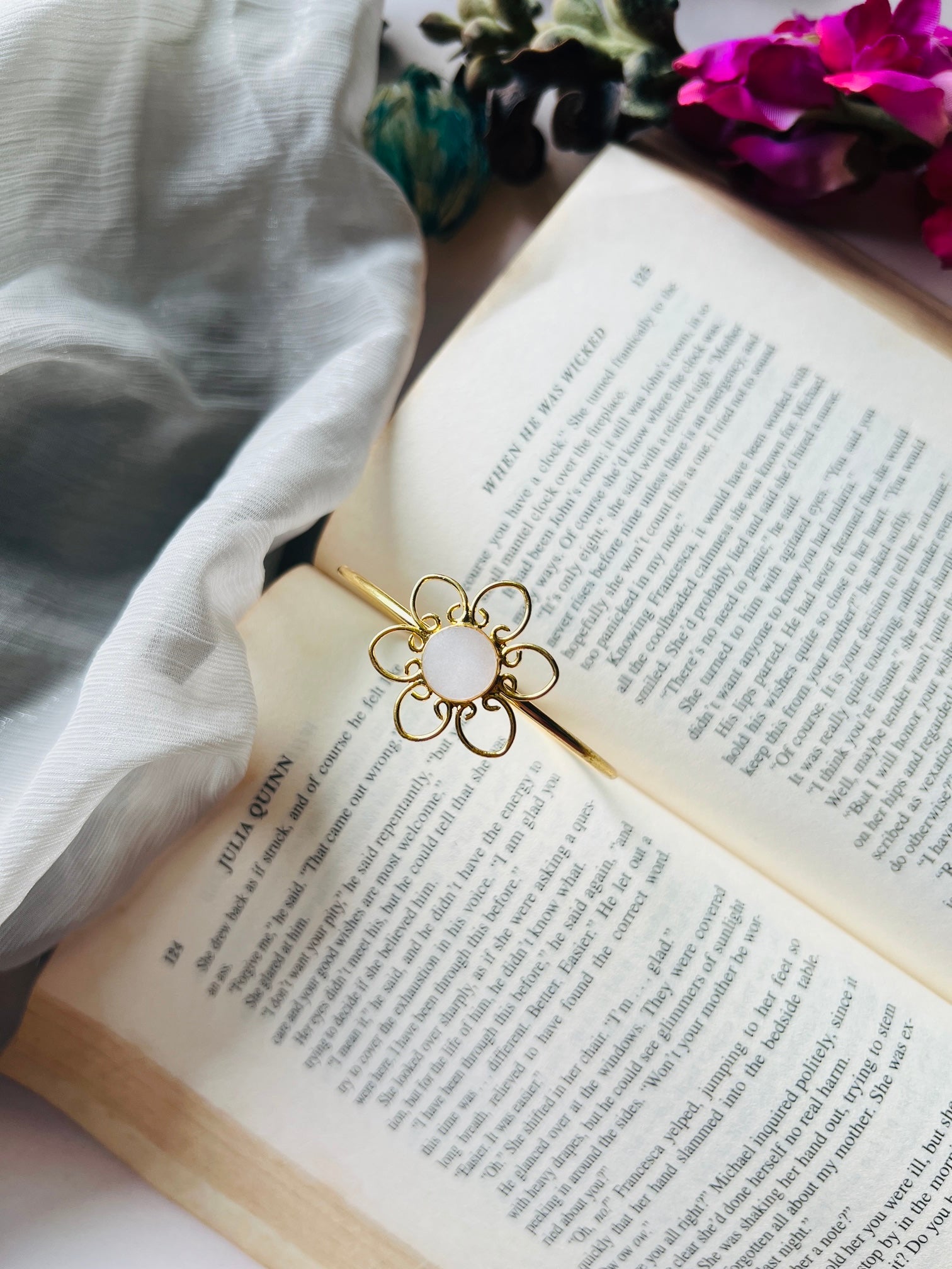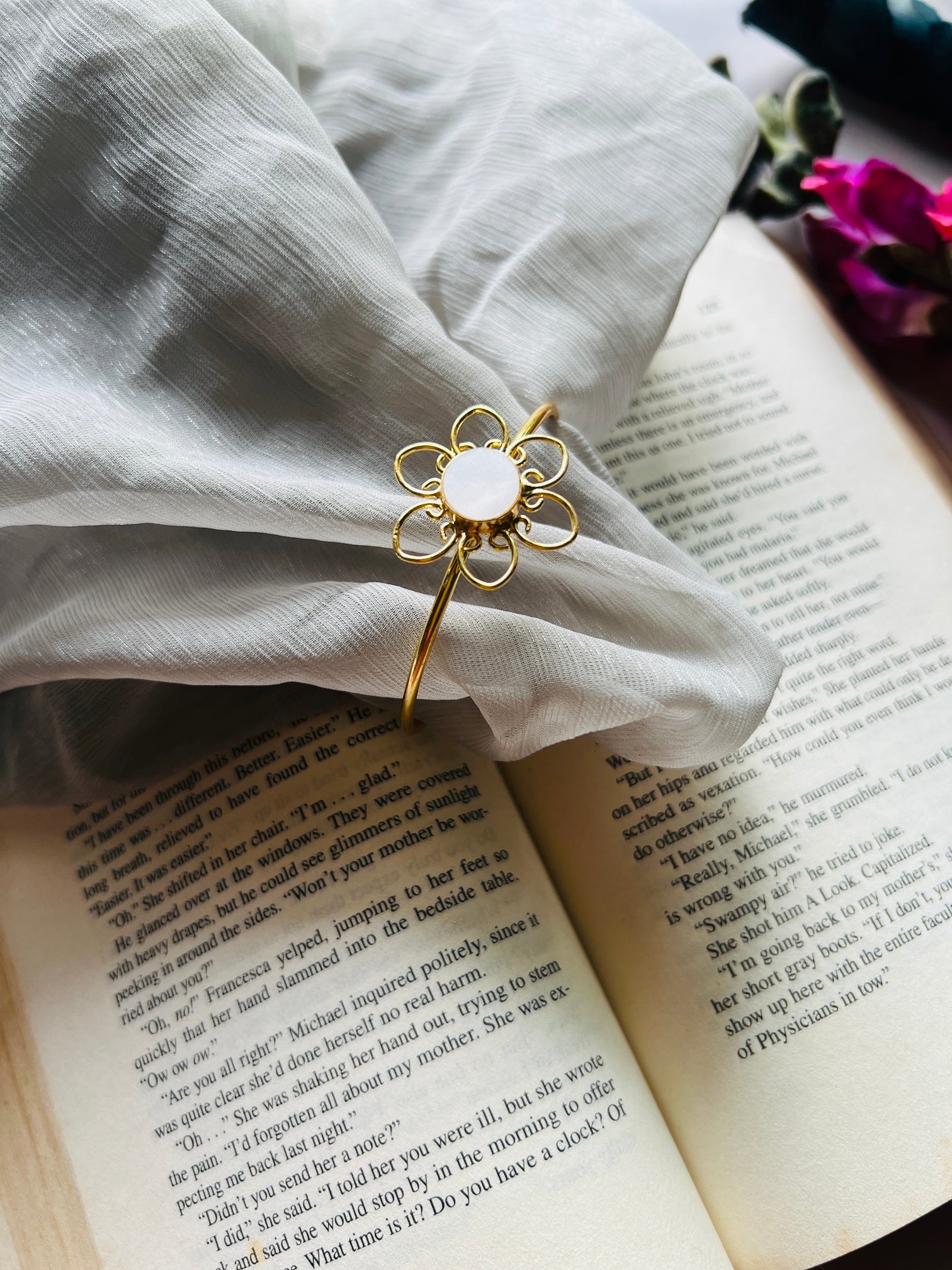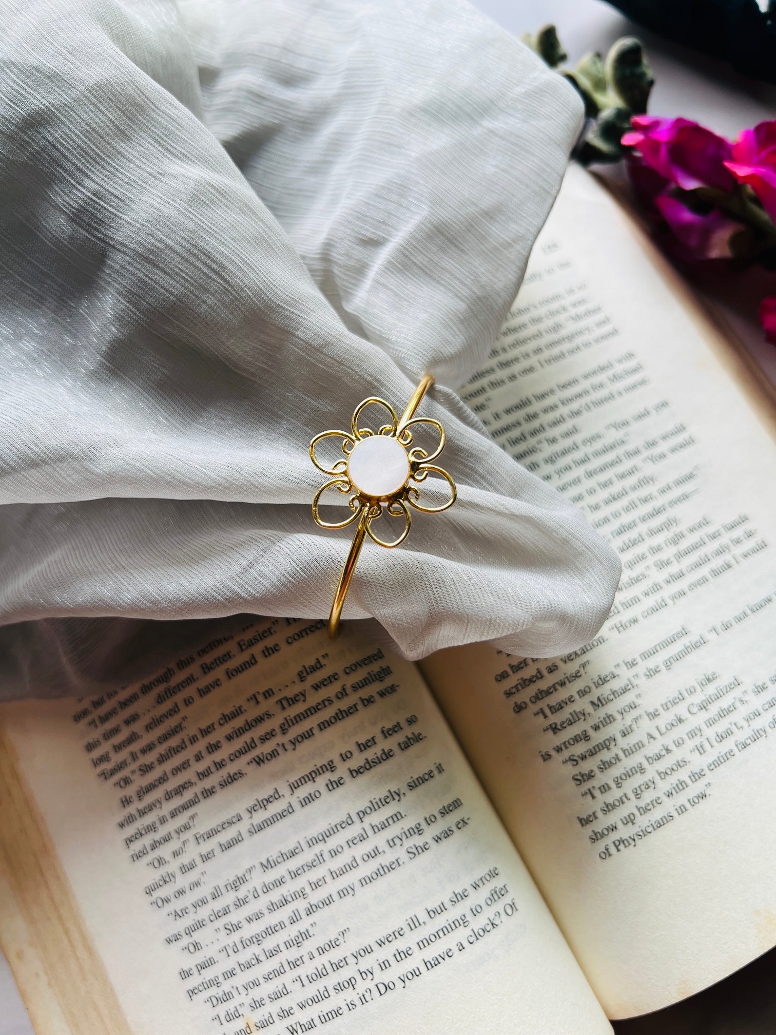 A perfect blend of contemporary elegance and ethnic charm, the Moon Petal Adjustable Bangle is designed to complement any style. Its delicate floral-inspired design is enhanced by a radiant Mother of Pearl (MOP) stone, exuding a soft, moonlit glow. The adjustable structure ensures a comfortable fit, making it a versatile piece that pairs effortlessly with both modern and traditional outfits. Stylish, timeless, and gracefully unique, this bangle is a true statement of refined beauty.