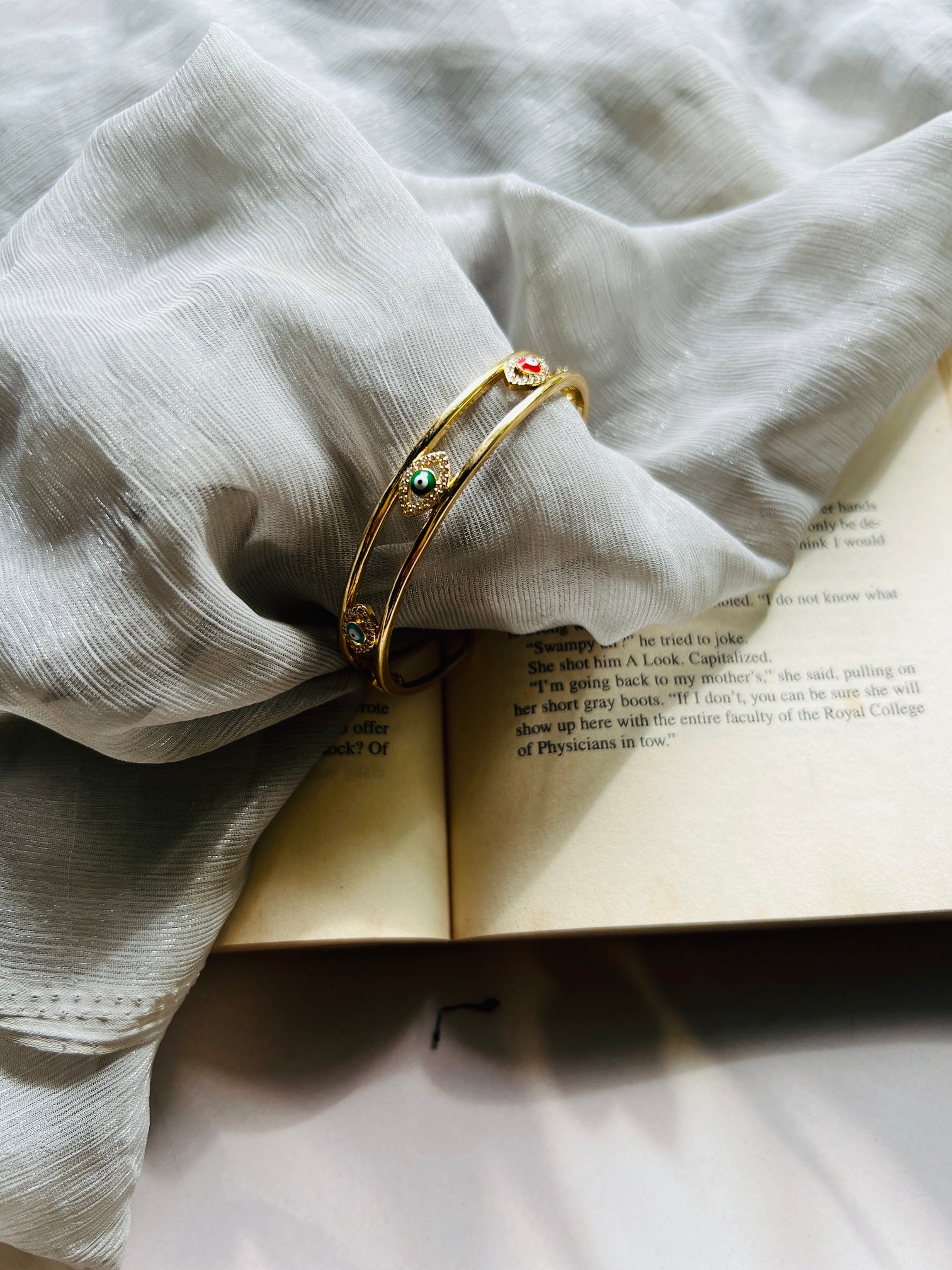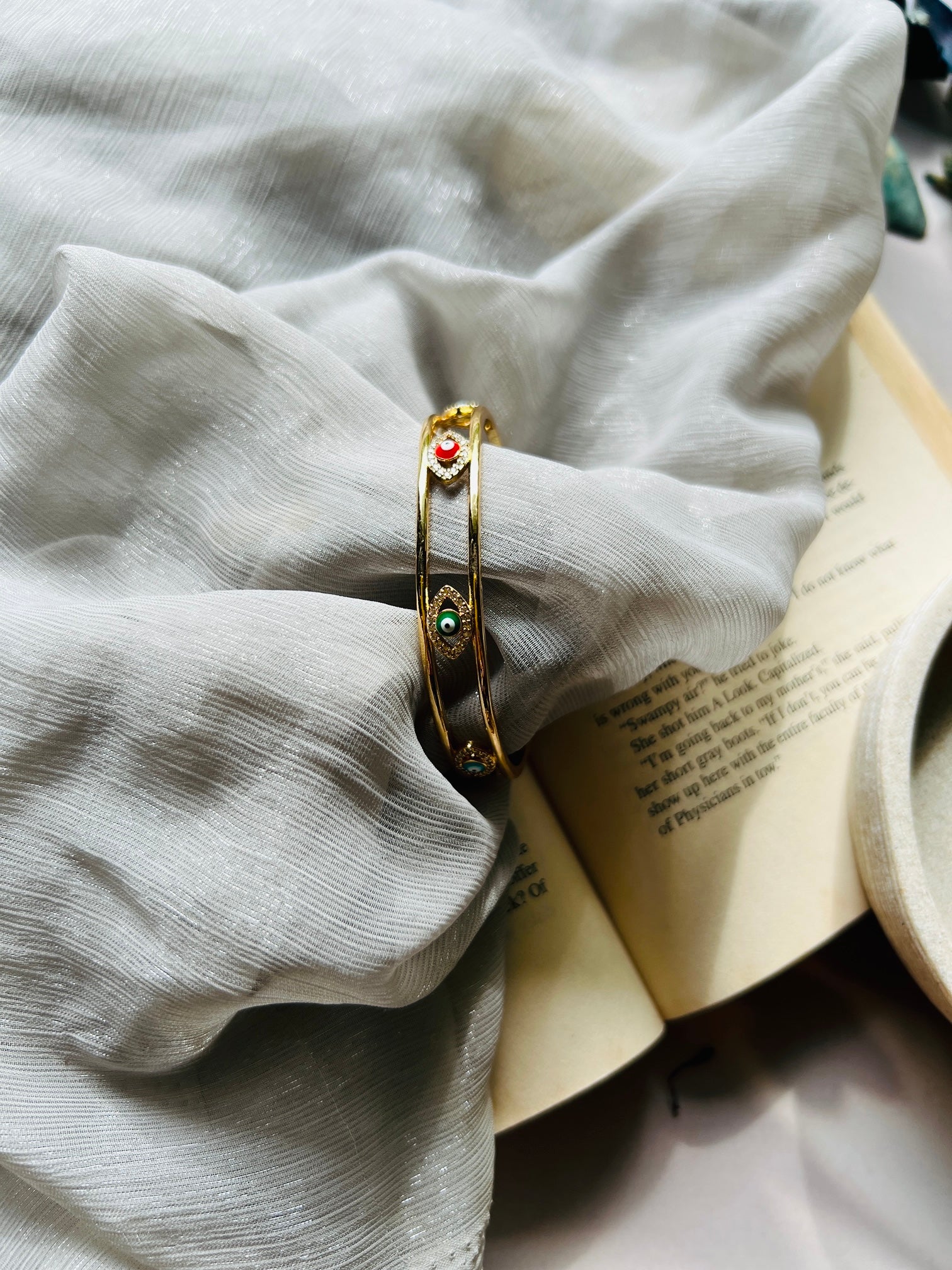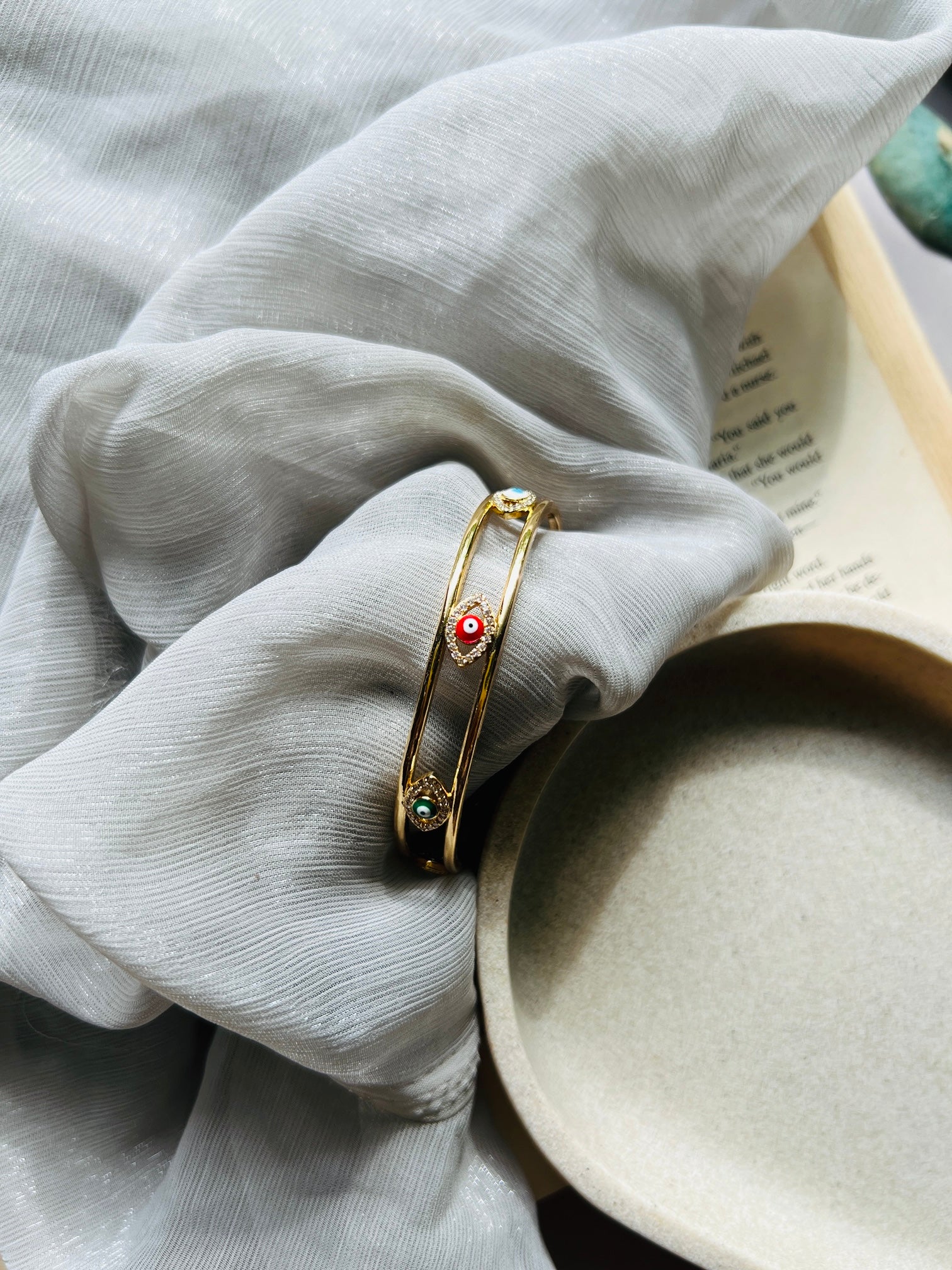 A striking cuff-style bangle adorned with multicolored evil eyes, symbolizing protection and positivity. Finished in radiant gold plating, this stylish bangle combines elegance with a touch of mystique. Its contemporary design makes it a versatile accessory—perfect for daily wear or to elevate any outfit with a bold, fashionable edge.