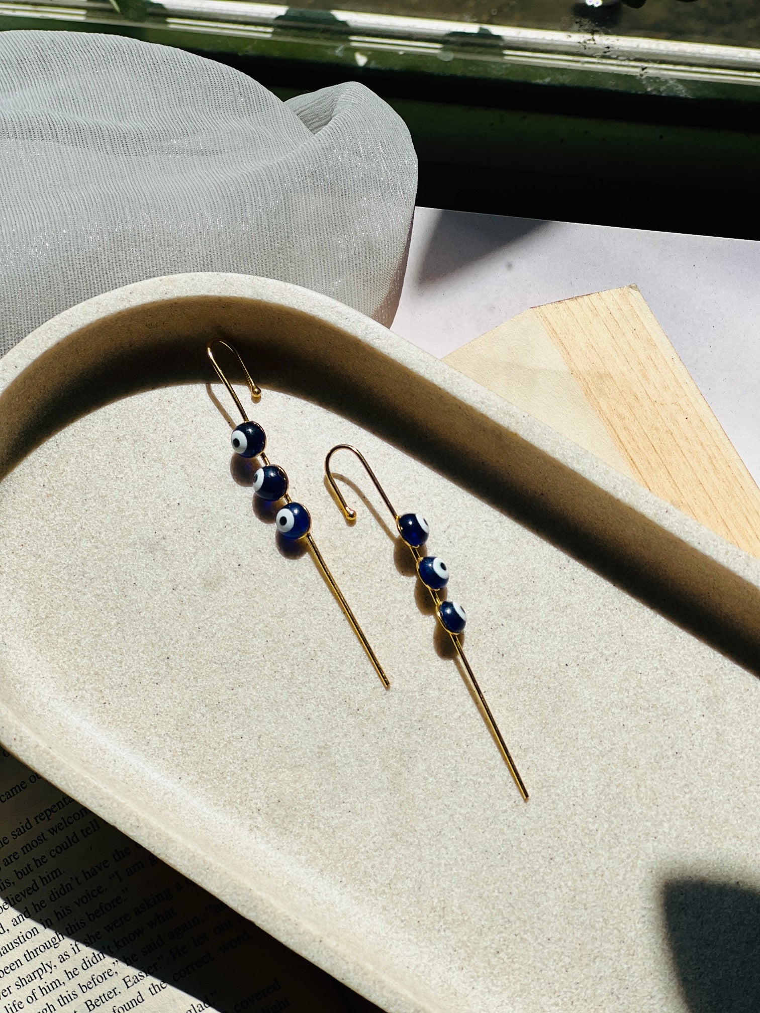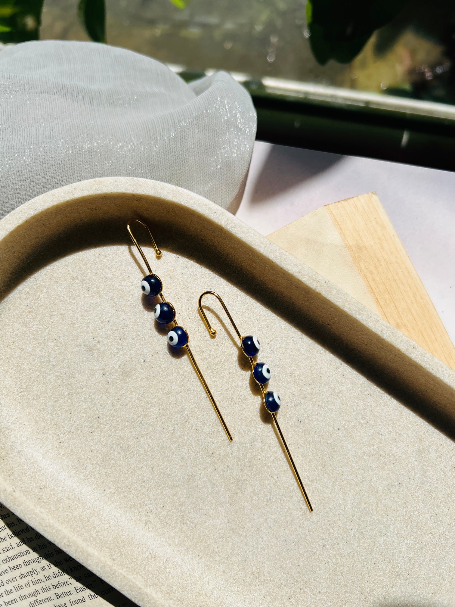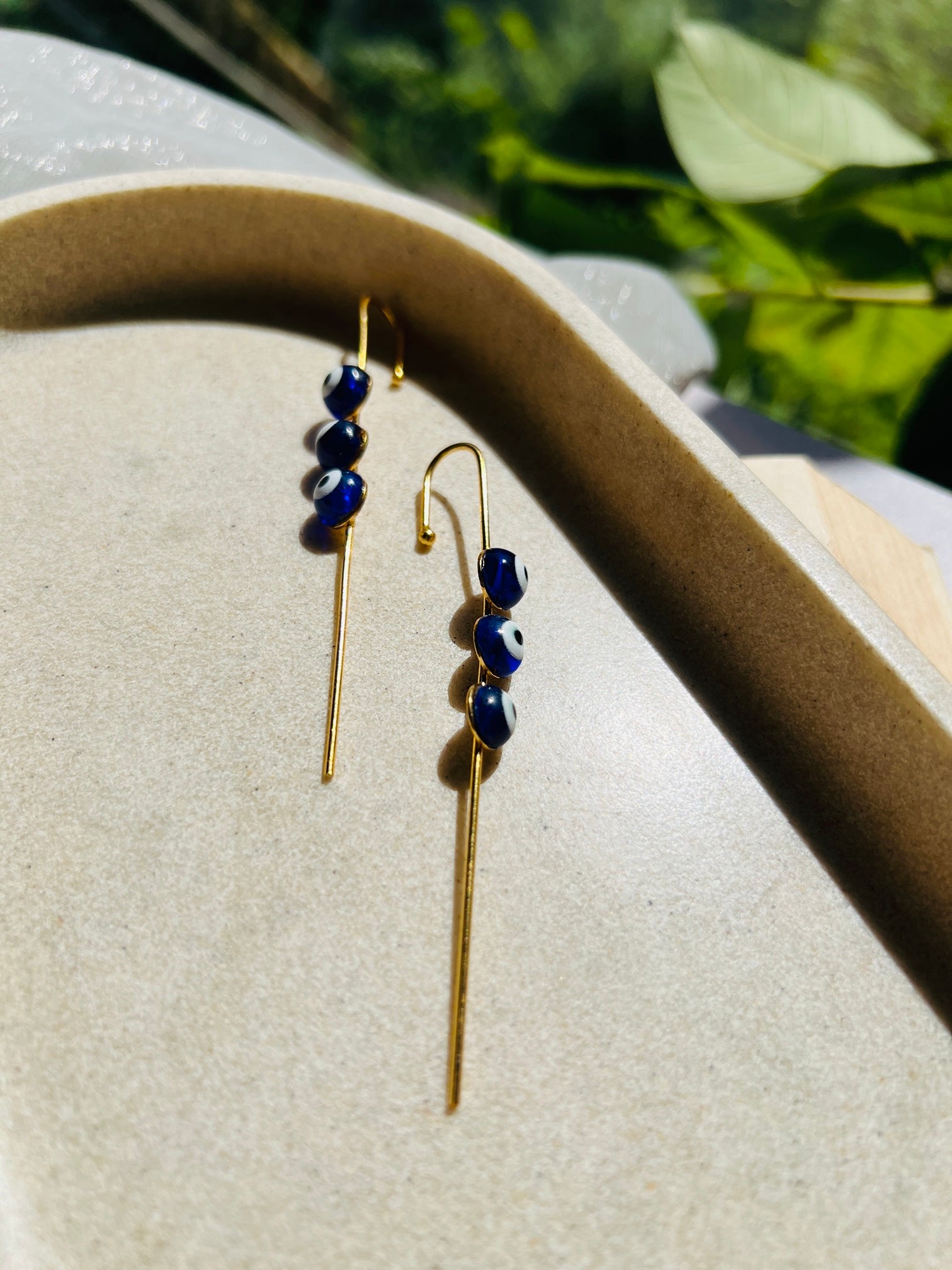 A striking and contemporary ear cuff designed with a sleek needle-like structure, adorned with three luminous pearls and violet-toned evil eye accents. This unique combination of elegance and mystique makes it both protective and fashionable. Gold-plated for a refined finish, it’s a versatile statement piece that adds charm and edge to any look—perfect for styling with both casual and festive outfits.