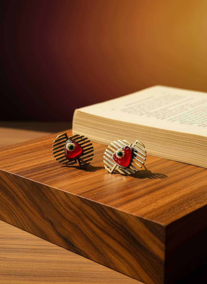A contemporary beauty crafted in silver, these stud earrings feature a striking centre stone framed by a clean geometric silhouette. Minimal yet expressive, they pair modern artistry with everyday elegance. Perfect for those who love refined designs with a hint of artistic charm.