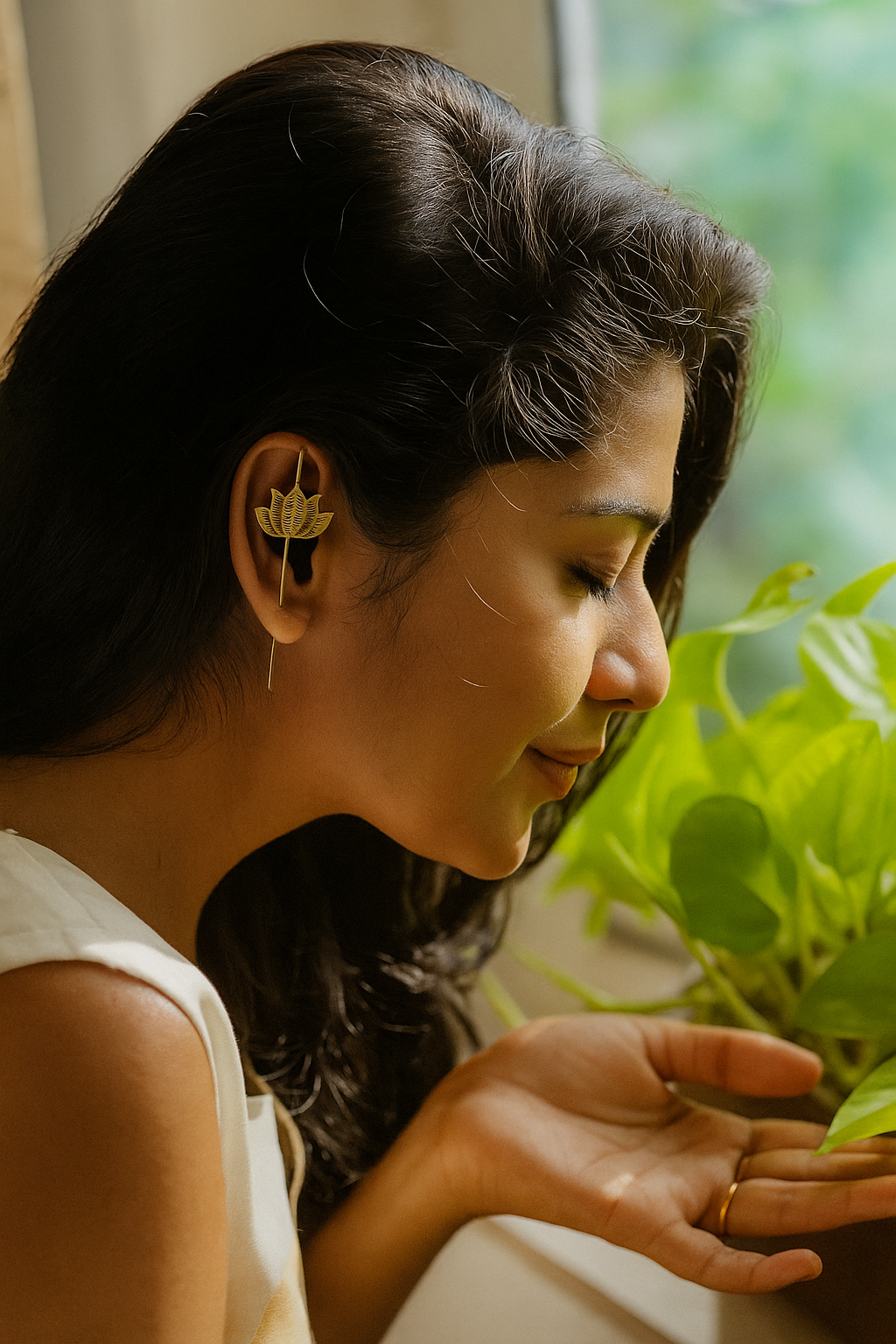 The Padma Ear Cuff is a stunning fusion of elegance and edge, inspired by the graceful beauty of the lotus flower. Crafted in a sleek needle-like design, this gold-plated contemporary piece wraps around the ear effortlessly, offering a stylish, modern take on traditional aesthetics. Whether paired with an ethnic ensemble or a chic modern look, the Padma Ear Cuff adds a touch of refined sophistication and bold statement style to any occasion.