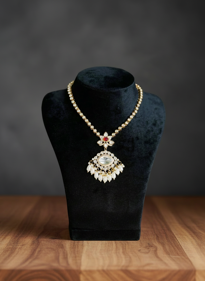 Unveiling the elegance of a truly unique design, a masterpiece that combines the brilliance of moissanite stones, the timeless beauty of pearls, the rich luster of kundan stones, and the sparkle of AD stones. This delicate arrangement of thin stone layers is thoughtfully crafted to form a simple yet striking chain, while the handcrafted pendant, highlighted by a small chili-red stone at the center, steals the spotlight with its captivating allure. The white stones throughout lend an air of sophistication and grace, making this necklace the perfect accessory for those seeking understated elegance with a touch of boldness