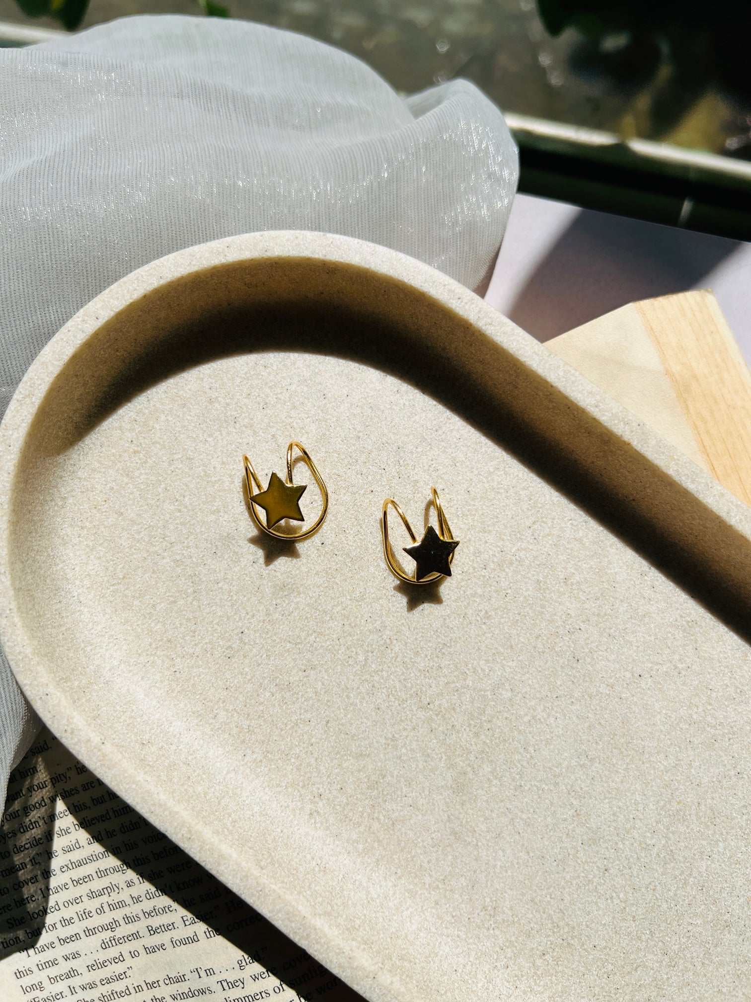 A chic gold-plated pressing-style ear cuff featuring a delicate star design. Lightweight and versatile, it can be styled at the top, middle, or any part of the ear for a modern, customized look. Its contemporary pattern adds just the right touch of sparkle and elegance—perfect for both everyday wear and special occasions.