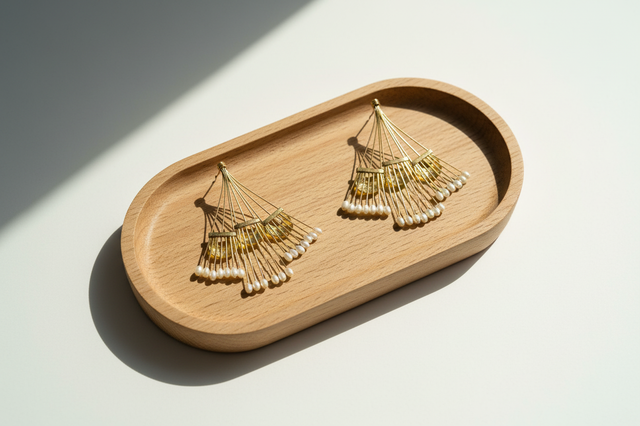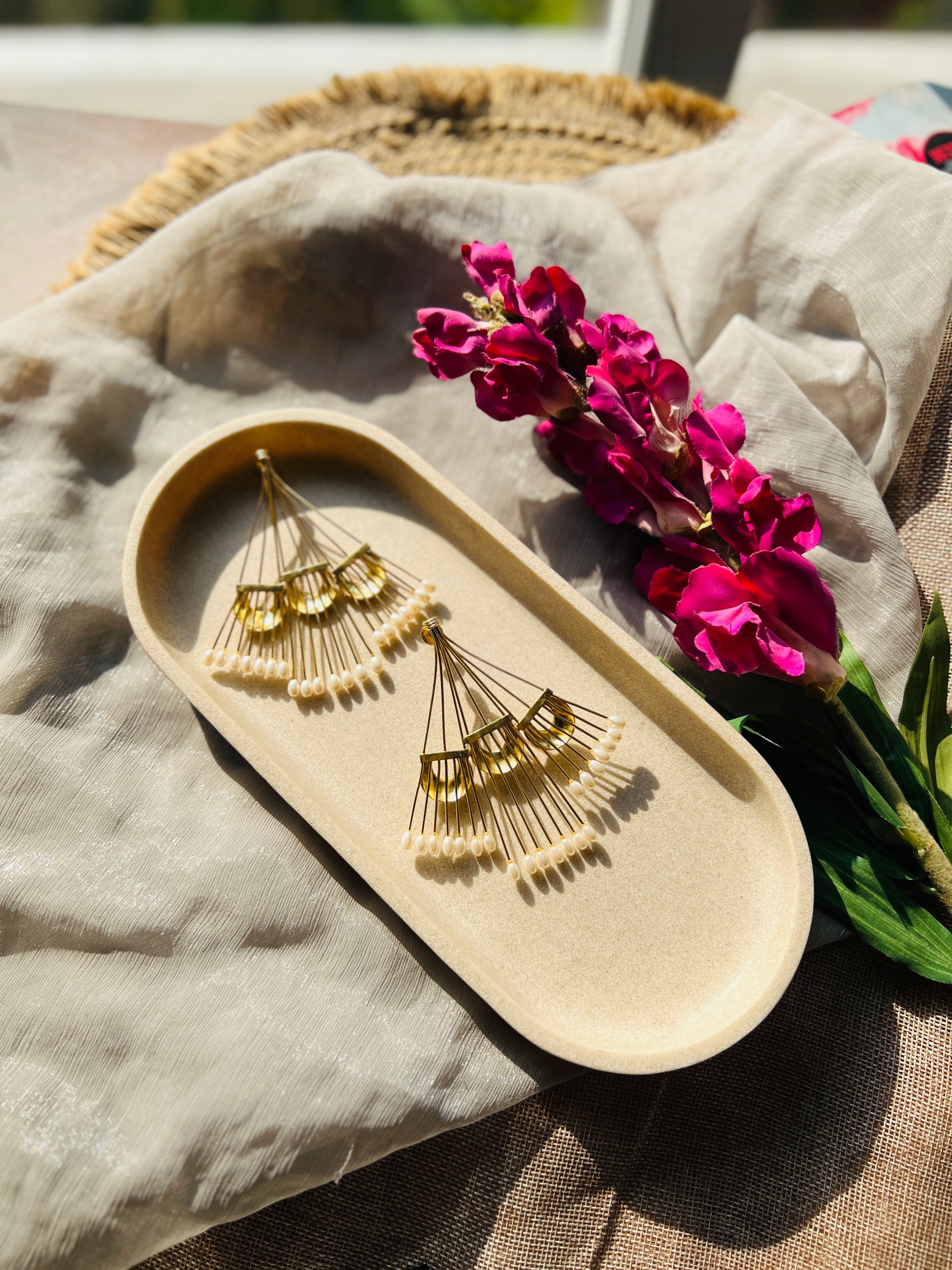 These graceful earrings are inspired by the elegant spread of a traditional hand fan. Crafted in a warm gold-toned finish, fine metal strands radiate outward, ending in soft ivory pearl droplets that sway gently with movement. The structured fan silhouette is balanced beautifully with the delicacy of pearls, creating a look that is both artistic and refined. Lightweight yet eye-catching, these earrings are perfect for festive occasions, ethnic wear, or adding a subtle statement to contemporary outfits. A timeless piece that blends tradition with modern design aesthetics.