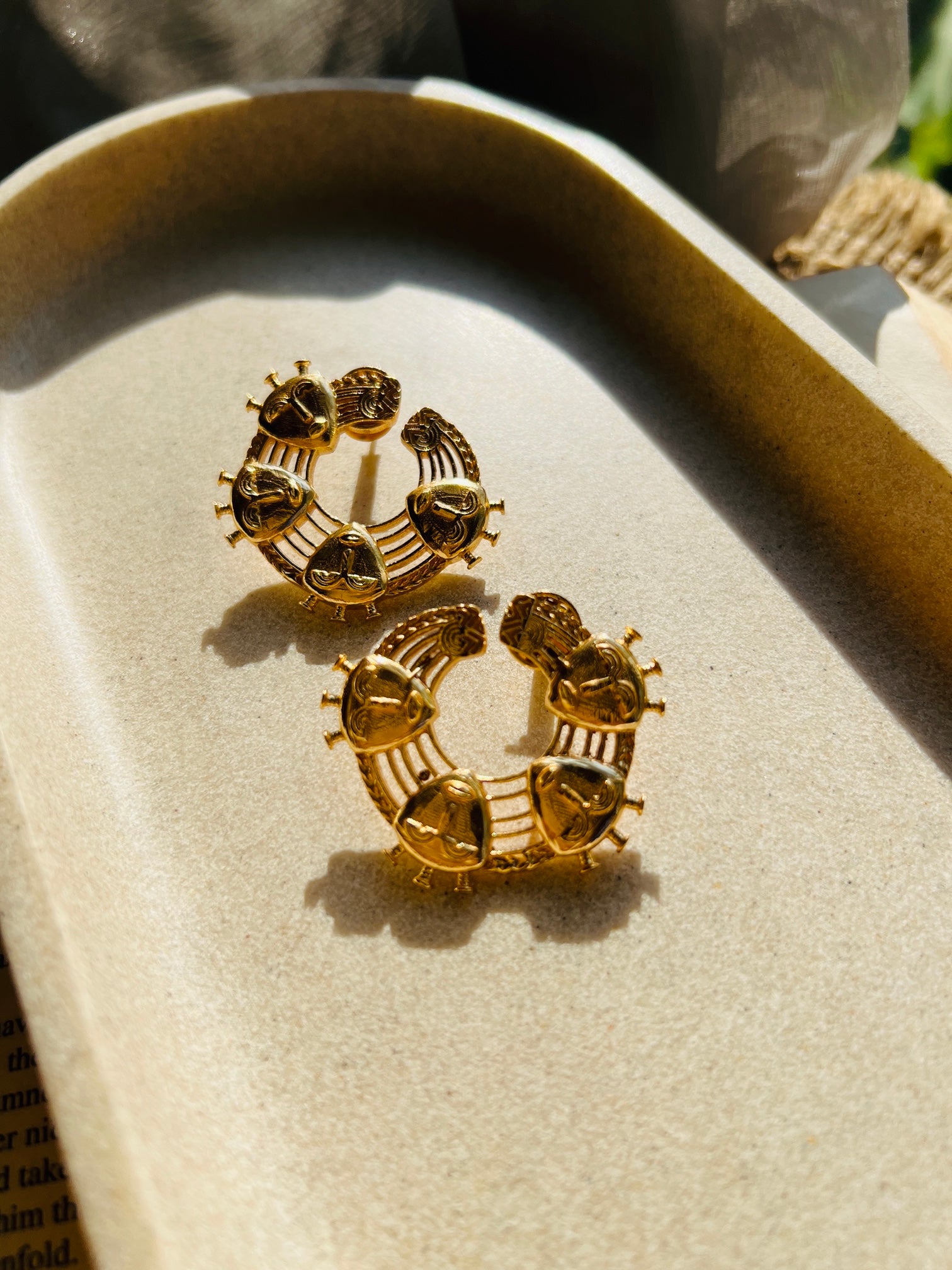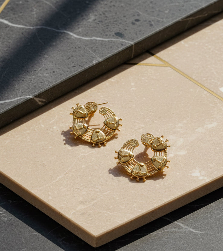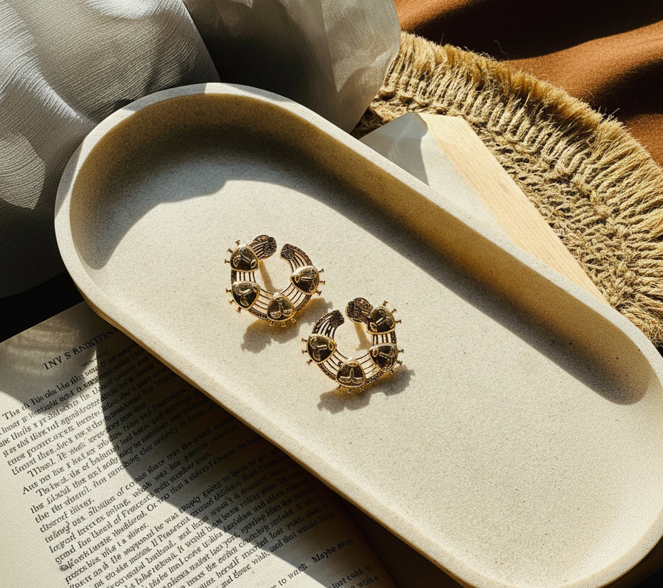 Temple Crest Studs are a powerful blend of heritage artistry and modern styling. Designed in a bold crescent form, these studs are detailed with intricate temple-inspired motifs, giving them a rich, sculptural presence. Each embossed element adds depth and texture, creating a look that feels both regal and timeless.