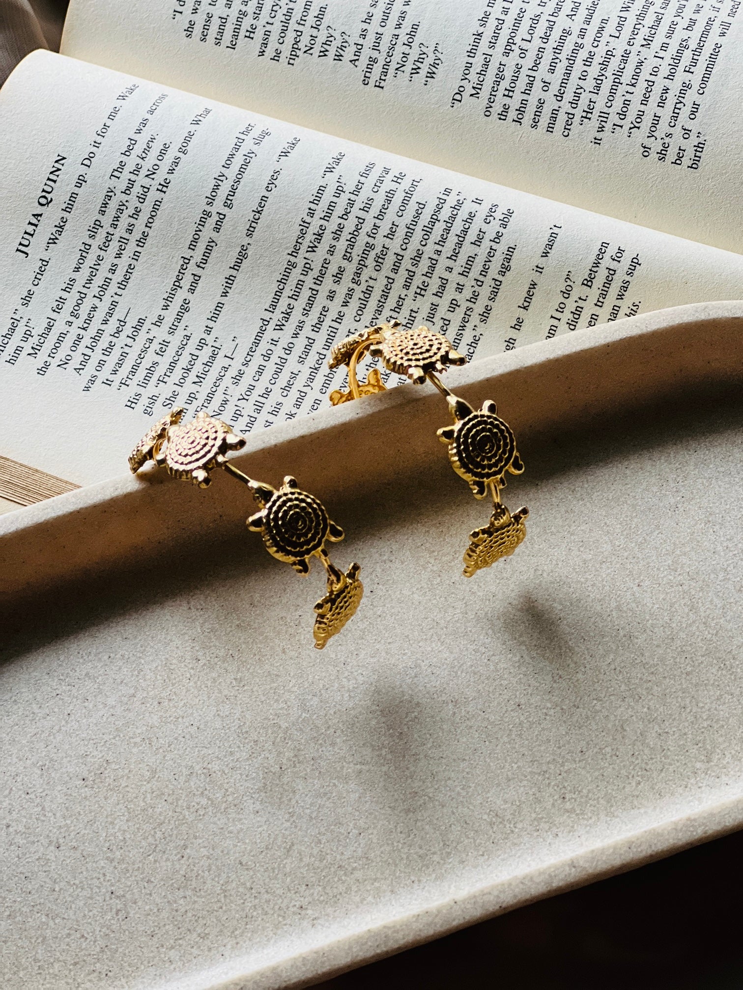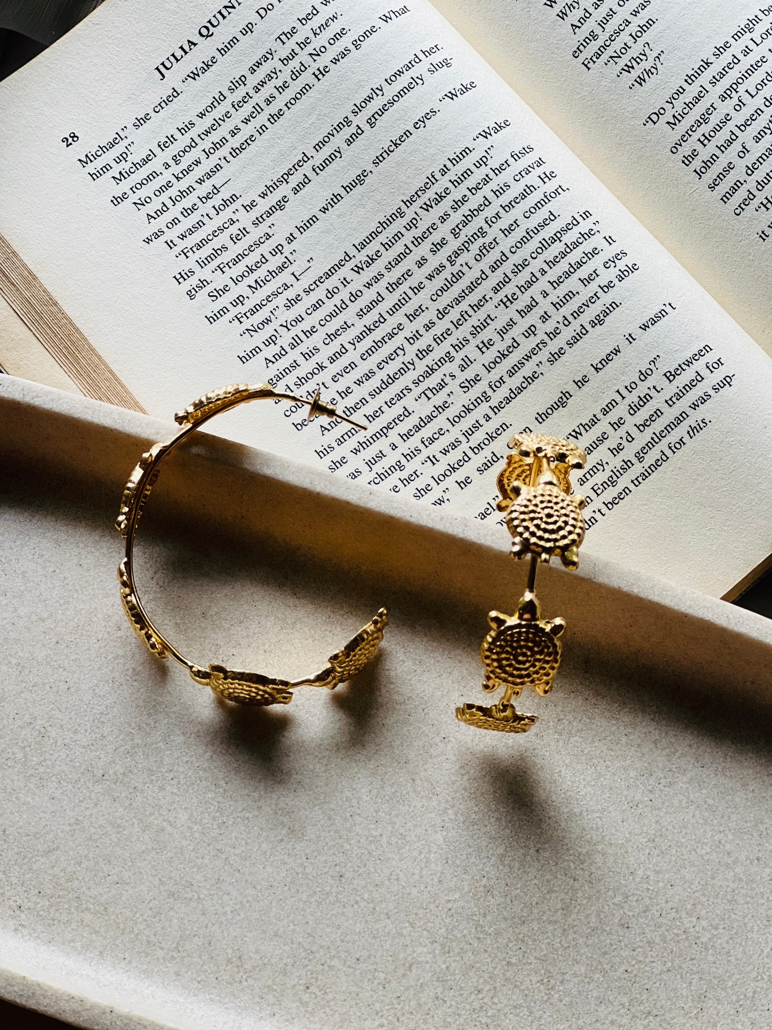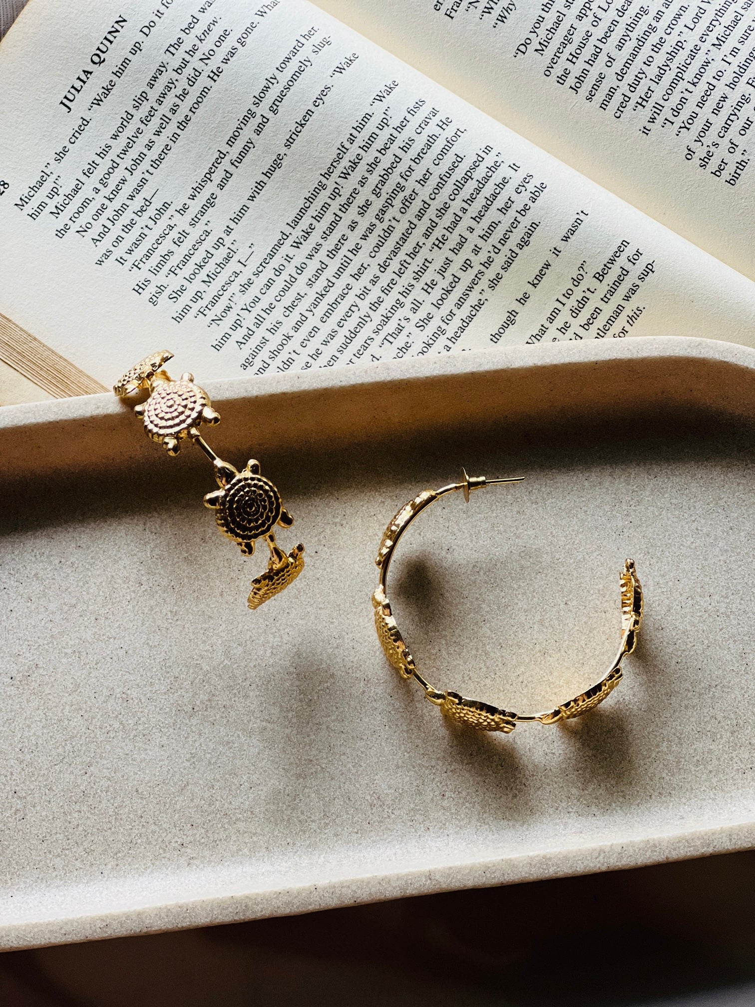 Elegant handmade Bali-style ear hoops, crafted with intricate gold-plated detailing and adorned with delicate turquoise accents. Their contemporary yet timeless design makes them perfect for everyday wear or styling up a chic look. A beautiful blend of tradition and modern charm, these hoops bring a touch of freshness and sophistication to your collection.