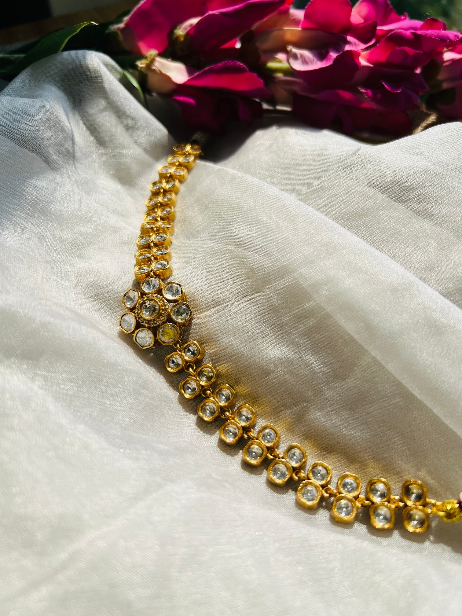 Handcrafted with meticulous precision, the shimmering brilliance of the moissanite stones reflects timeless elegance. Whether paired with traditional sarees, contemporary party wear, or any occasional outfit, this exquisite piece promises to add a touch of sophistication and charm.
