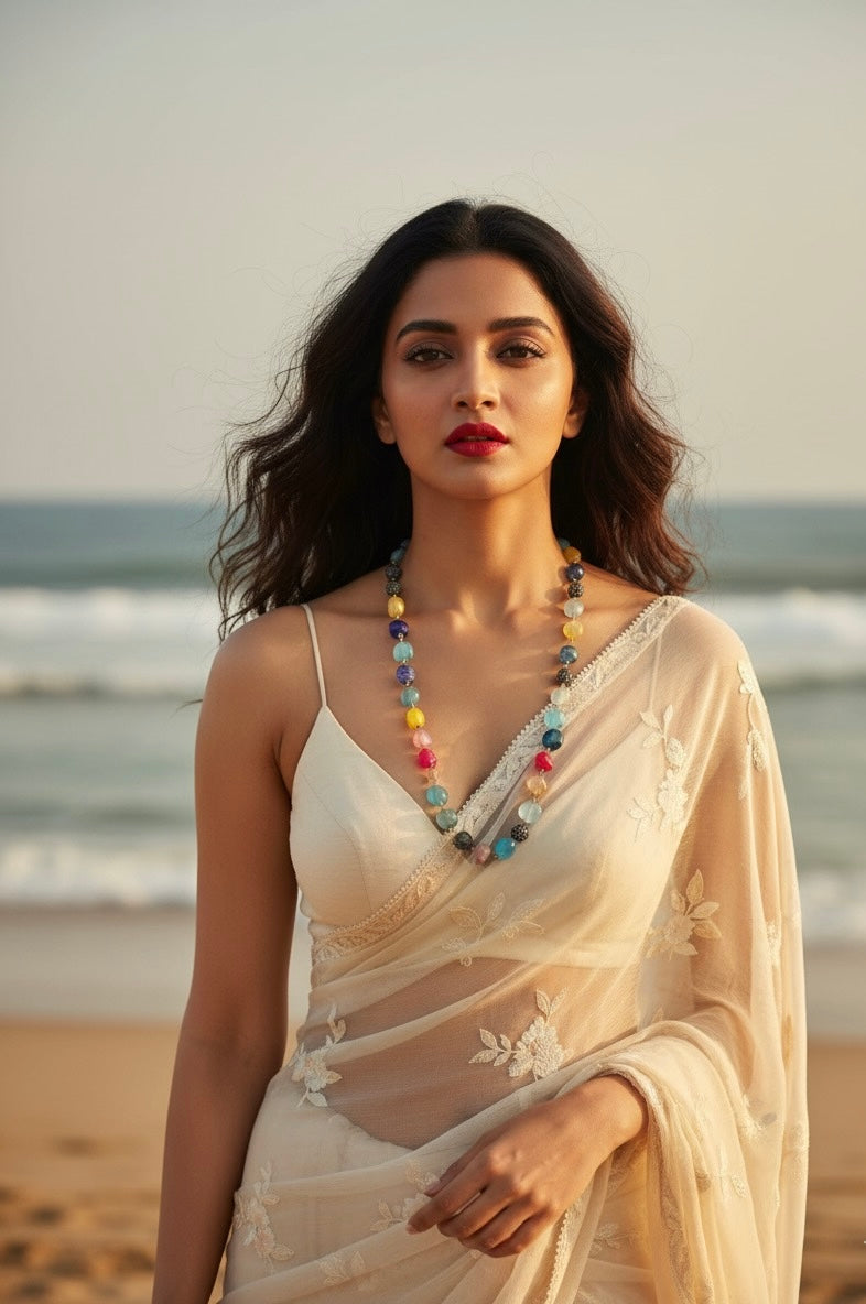 Add a burst of color to your collection with the Vibrant Rasa Mala, a long necklace that brings together an exquisite combination of vibrant shades in blue, green, teal blue, magenta, pale blue, and powder blue. The necklace features rich trumble stones interspersed with pepper stone beads, creating a stunning contrast and a lively effect. Each stone, carefully selected for its unique hue, forms a captivating arrangement that reflects your bold sense of style. Whether worn with a casual or formal outfit, this necklace is sure to turn heads and add a playful yet elegant touch to any look.