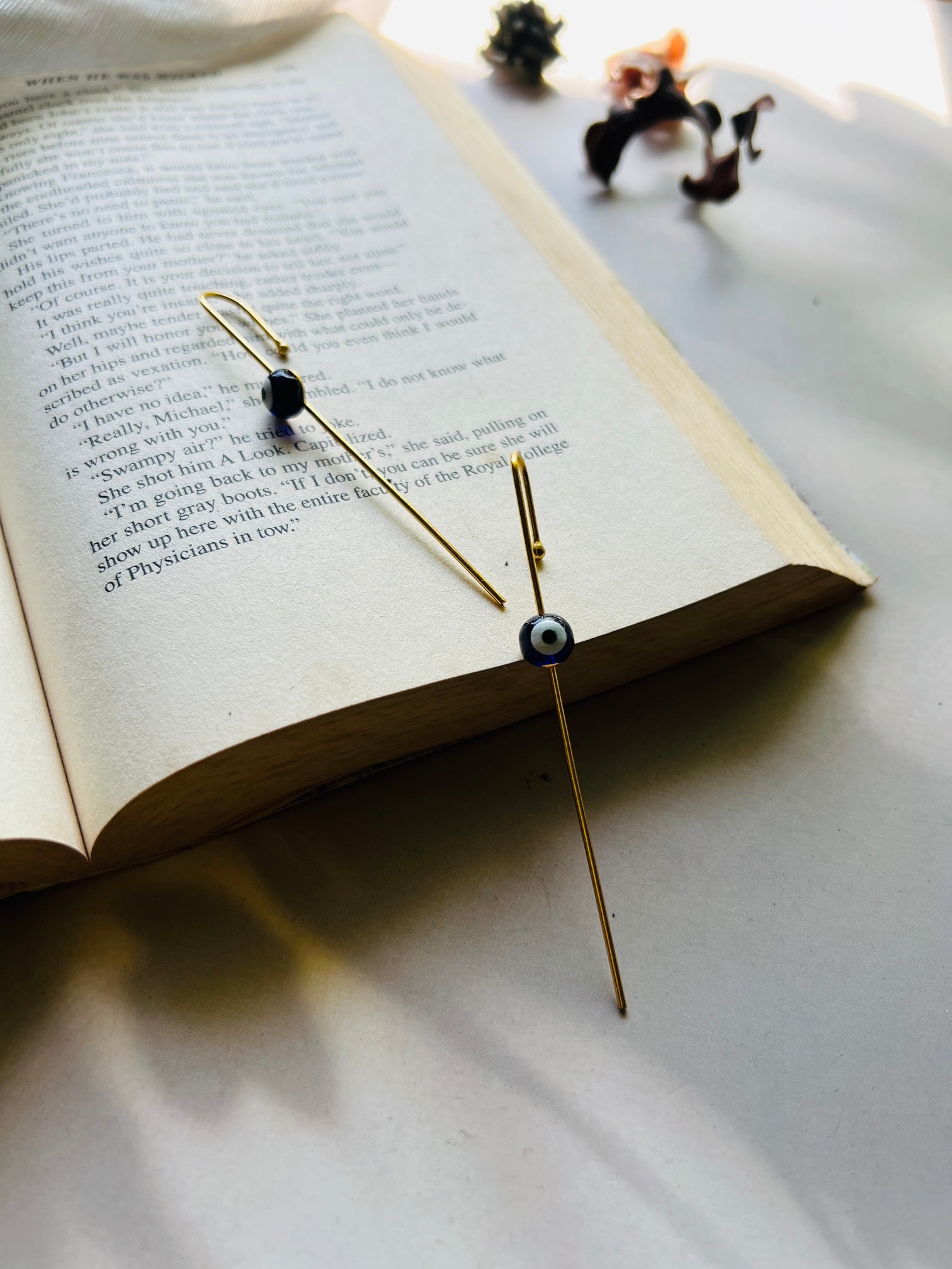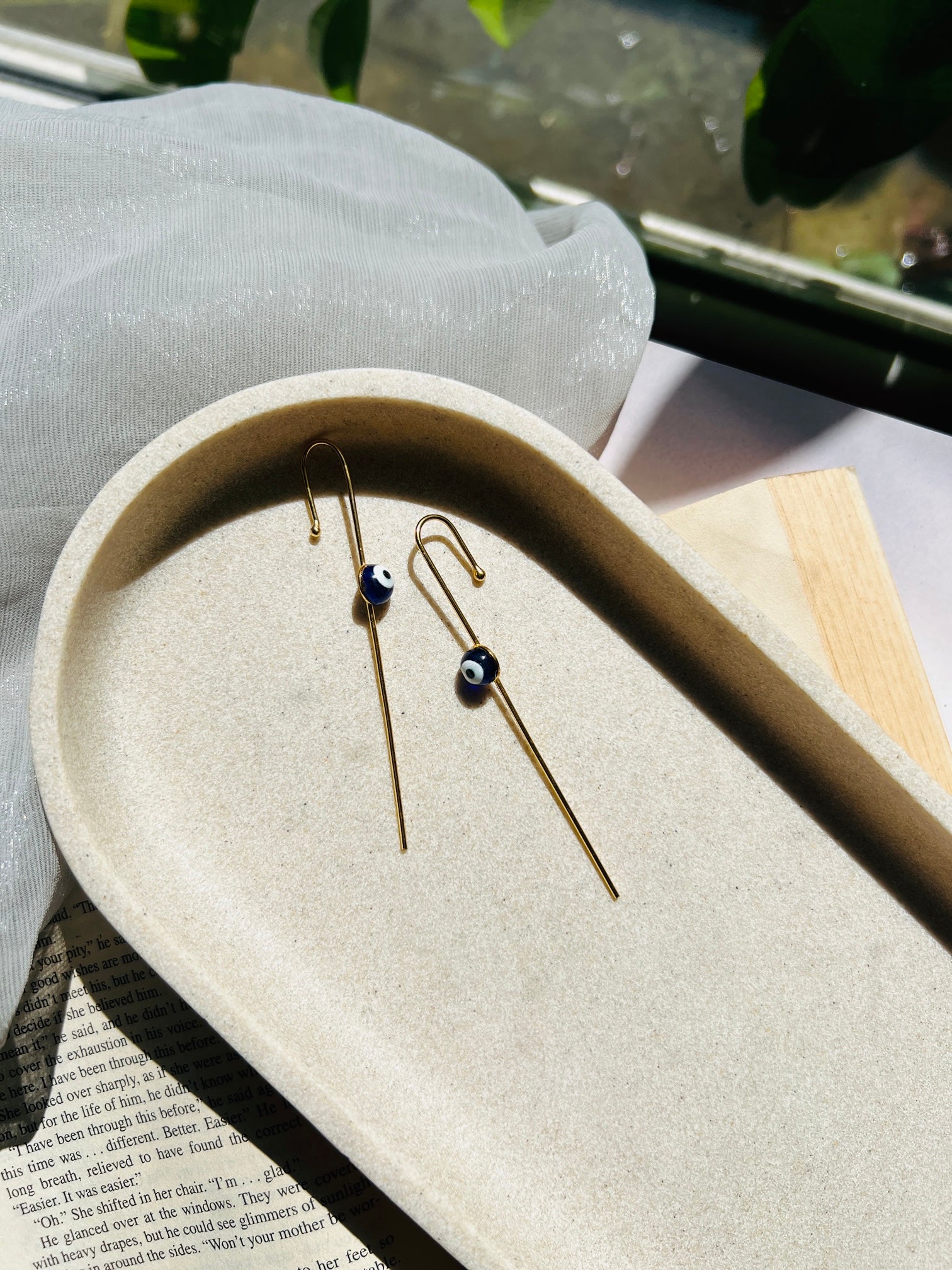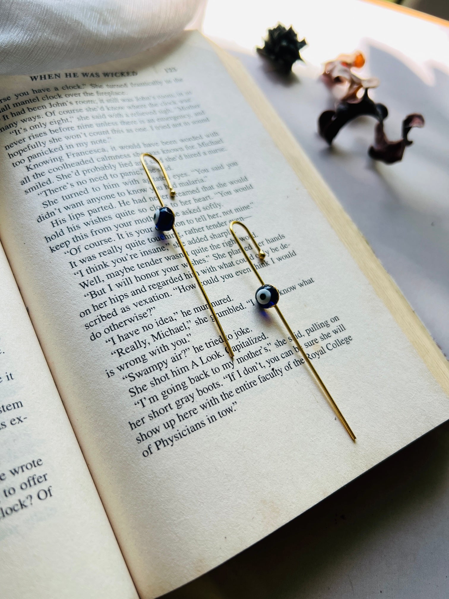 A sleek needle-style ear cuff adorned with a single evil eye bead in tones of violet, white, and black. Minimal yet striking, this gold-plated cuff adds a touch of mystique and protection while keeping your look stylish and contemporary. Its simple yet bold design makes it easy to wear and versatile enough to style your way—perfect for everyday chic or a layered jewelry look.